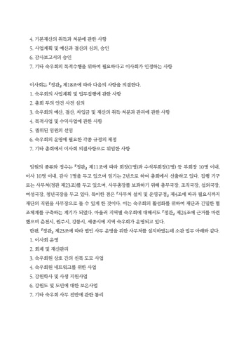 4. %uae30%ubcf8%uc7ac%uc0b0%uc758 %ucde8%ub4dd%uacfc %ucc98%ubd84%uc5d0 %uad00%ud55c %uc0ac%ud56d5. %uc0ac%uc5c5%uacc4%ud68d %ubc0f %uc608%uc0b0%uacfc %uacb0%uc0b0%uc758 %uc2ec%uc758, %uc2b9%uc7786. %uac10%uc0ac%ubcf4%uace0%uc11c%uc758 %uc2b9%uc7787. %uae30%ud0c0 %uc219%uc6b0%ud68c%uc758 %ubaa9%uc801%uc218%ud589%uc744 %uc704%ud558%uc5ec %ud544%uc694%ud558%ub2e4%uace0 %uc774%uc0ac%ud68c%uac00 %uc778%uc815%ud558%ub294 %uc0ac%ud56d%uc774%uc0ac%ud68c%ub294 %u300e%uc815%uad00%u300f %uc81c18%uc870%uc5d0 %ub530%ub77c %ub2e4%uc74c%uc758 %uc0ac%ud56d%uc744 %uc758%uacb0%ud55c%ub2e4.1. %uc219%uc6b0%ud68c%uc758 %uc0ac%uc5c5%uacc4%ud68d %ubc0f %uc5c5%ubb34%uc9d1%ud589%uc5d0 %uad00%ud55c %uc0ac%ud56d2. %ucd1d%ud68c %ubd80%uc758 %uc548%uac74 %uc0ac%uc804 %uc2ec%uc7583. %uc219%uc6b0%ud68c%uc758 %uc608%uc0b0, %uacb0%uc0b0, %ucc28%uc785%uae08 %ubc0f %uc7ac%uc0b0%uc758 %ucde8%ub4dd%u00b7%ucc98%ubd84%uacfc %uad00%ub9ac%uc5d0 %uad00%ud55c %uc0ac%ud56d4. %ubaa9%uc801%uc0ac%uc5c5 %ubc0f %uc218%uc775%uc0ac%uc5c5%uc5d0 %uad00%ud55c %uc0ac%ud56d5. %uad90%uc704%ub41c %uc784%uc6d0%uc758 %uc120%uc7846. %uc219%uc6b0%ud68c%uc758 %uc6b4%uc601%uc5d0 %ud544%uc694%ud55c %uac01%uc885 %uaddc%uc815%uc758 %uc81c%uc815 7. %uae30%ud0c0 %ucd1d%ud68c%uc5d0%uc11c %uc774%uc0ac%ud68c %uc758%uacb0%uc0ac%ud56d%uc73c%ub85c %uc704%uc784%ud55c %uc0ac%ud56d%uc784%uc6d0%uc758 %uc885%ub958%uc640 %uc815%uc218%ub294 %u300e%uc815%uad00%u300f %uc81c11%uc870%uc5d0 %ub530%ub77c %ud68c%uc7a5(1%uba85)%uacfc %uc218%uc11d%ubd80%ud68c%uc7a5(1%uba85) %ub4f1 %ubd80%ud68c%uc7a5 10%uba85 %uc774%ub0b4, %uc774%uc0ac 10%uba85 %uc774%ub0b4, %uac10%uc0ac 1%uba85%uc744 %ub450%uace0 %uc788%uc73c%uba70 %uc784%uae30%ub294 2%ub144%uc73c%ub85c %ud558%uc5ec %ucd1d%ud68c%uc5d0%uc11c %uc120%ucd9c%ud558%uace0 %uc788%ub2e4. %uc9d1%ud589 %uae30%uad6c%ub85c%ub294 %uc0ac%ubb34%ucc98(%uc815%uad00 %uc81c23%uc870)%ub97c %ub450%uace0 %uc788%uc73c%uba70, %uc0ac%ubb34%ucd1d%uc7a5%ub97c %ubcf4%uc88c%ud558%uae30 %uc704%ud574 %ucd1d%ubb34%uad6d%uc7a5, %uc870%uc9c1%uad6d%uc7a5, %uc12d%uc678%uad6d%uc7a5, %uc5ec%uc131%uad6d%uc7a5, %uccad%ub144%uad6d%uc7a5%uc744 %ub450%uace0 %uc788%ub2e4. %ud2b9%uc774%ud55c %uc810%uc740 %u300e%uc0ac%ubb34%ucc98 %uc124%uce58 %ubc0f %uc6b4%uc601%uaddc%uc815%u300f %uc81c4%uc870%uc5d0 %ub530%ub77c %ud544%uc694%uc2dc%uae4c%uc9c0 %uc7ac%ub2e8%uc758 %uc9c1%uc6d0%uc744 %uc0ac%ubb34%uc7a5%uc73c%ub85c %ub458 %uc218 %uc788%uac8c %ud55c %uac83%uc774%ub2e4. %uc774%ub294 %uc219%uc6b0%ud68c%uc758 %ud65c%uc131%ud654%ub97c %uc704%ud558%uc5ec %uc7ac%ub2e8%uacfc %uae34%ubc00%ud55c %ud611%uc870%uccb4%uacc4%ub97c %uad6c%ucd95%ud558%ub294 %uacc4%uae30%uac00 %ub418%uc5c8%ub2e4. %uc544%uc6b8%ub7ec %uc9c0%uc5ed%ubcc4 %uc219%uc6b0%ud68c%uc5d0 %ub300%ud574%uc11c%ub3c4 %u300e%uc815%uad00%u300f %uc81c24%uc870%uc5d0 %uadfc%uac70%ub97c %ub9c8%ub828%ud588%uc73c%uba70 %ucd98%ucc9c%uc2dc, %uc6d0%uc8fc%uc2dc, %uac15%ub989%uc2dc, %uc138%uc885%uc2dc%uc5d0 %uc9c0%uc5ed %uc219%uc6b0%ud68c%uac00 %uc6b4%uc601%ub418%uace0 %uc788%ub2e4. %ud55c%ud3b8, %u300e%uc815%uad00%u300f %uc81c23%uc870%uc5d0 %ub530%ub77c %ubc95%uc778 %uc0ac%ubb34 %uc6b4%uc601%uc744 %uc704%ud55c %uc0ac%ubb34%ucc98%ub97c %uc124%uce58%ud558%uc600%ub294%ub370 %uc18c%uad00 %uc5c5%ubb34 %uc544%ub798%uc640 %uac19%ub2e4.1. %uc774%uc0ac%ud68c %uc6b4%uc6012. %ud68c%uacc4 %ubc0f %uc7ac%uc0b0%uad00%ub9ac3. %uc219%uc6b0%ud68c%uc6d0 %uc0c1%ud638 %uac04%uc758 %uce5c%ubaa9 %ub3c4%ubaa8 %uc0ac%uc5c54. %uc219%uc6b0%ud68c%uc6d0 %ub124%ud2b8%uc6cc%ud06c%ub97c %uc704%ud55c %uc0ac%uc5c55. %uac15%uc6d0%ud559%uc0ac %ubc0f %uc0ac%uc0dd %uc9c0%uc6d0%uc0ac%uc5c56. %uac15%uc6d0%ub3c4 %ubc0f %ub3c4%ubbfc%uc5d0 %ub300%ud55c %ubcf4%uc740%uc0ac%uc5c57. %uae30%ud0c0 %uc219%uc6b0%ud68c %uc0ac%ubb34 %uc804%ubc18%uc5d0 %uad00%ud55c %ud1b5%ub9ac