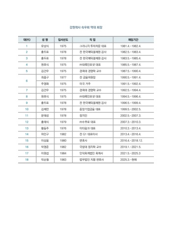 %uac15%uc6d0%ud559%uc0ac %uc219%uc6b0%ud68c %uc5ed%ub300 %ud68c%uc7a5%ub300(%u4ee3)%uc131 %uba85%uc785%uc0ac%ub144%ub3c4%uc9c1 %uc5c5%uc7ac%uc784%uae30%uac041%uc720%ub0a8%uc2dd1975%uadf8%ub9ac%ub2c8%uce58 %ud22c%uc790%uc790%ubb38 %ub300%ud45c1981.4.~1982.4.2%ud64d%ub450%ud45c1978%uc804 %ud55c%uad6d%uc608%ud0c1%uacb0%uc7ac%uc6d0 %uac10%uc0ac1982.5.~1983.4.3%ud64d%ub450%ud45c1978%uc804 %ud55c%uad6d%uc608%ud0c1%uacb0%uc7ac%uc6d0 %uac10%uc0ac1983.5.~1985.4.4%uc6d0%ud638%uc2dd1975%u321c%ub300%ub959%uc778%ud3ec%ub137 %ub300%ud45c1985.5.~1987.4.5%uae40%uac74%uc6b01975%uacbd%ud76c%ub300 %uacbd%uc601%ud559 %uad50%uc2181987.5.~1990.4.6%ucd5c%uc885%uad6c1977%uc804 %uae08%uc735%uc704%uc6d0%uc7a51990.5.~1991.4.%uc8fc%uc601%ud6541975%ubbf8%uad6d %uac70%uc8fc1991.5.~1992.4.7%uae40%uac74%uc6b01975%uacbd%ud76c%ub300 %uacbd%uc601%ud559 %uad50%uc2181992.5.~1994.4.8%uc6d0%ud638%uc2dd1975%u321c%ub300%ub959%uc778%ud3ec%ub137 %ub300%ud45c1994.5.~1996.4.9%ud64d%ub450%ud45c1978%uc804 %ud55c%uad6d%uc608%ud0c1%uacb0%uc7ac%uc6d0 %uac10%uc0ac1996.5.~1999.4.10%uae40%uc7ac%uc5b81978%uc911%uc559%uae30%uc5c5%uae08%uc735 %ub300%ud45c1999.5.~2002.5.11%ubb38%ud0dc%uc1311978%uc815%uce58%uc7782002.5.~2007.3.12%ud64d%ud0dc%uc2dd1979%u321c%uc218%ud478%ub85c %ub300%ud45c2007.3.~2010.3.13%ud669%ub3d9%uc8fc1976%uc774%ud2f0%ub9c1%ud06c %ub300%ud45c2010.3.~2013.4.14%ud5c8%uc778%uad6c1982%uc804 G1 %ub300%ud45c%uc774%uc0ac2013.4.~2016.4.15%uc774%uc0c1%uc6a91980%ubcc0%ud638%uc0ac2016.4.~2018.12.16%ubc15%uc601%uc9001982%uad6d%ubc29%ub300 %uc815%uce58%ud559 %uad50%uc2182019.1.~2021.5.17%uc774%uc6d0%uc12d1984%uc778%ub355%ud68c%uacc4%ubc95%uc778 %ud68c%uacc4%uc0ac2021.5.~2025.318%ubc15%uc21c%ucca01983%ubc95%ubb34%ubc95%uc778 %uc9c0%ud3c9 %ubcc0%ud638%uc0ac2025.3.~%ud604%uc7ac