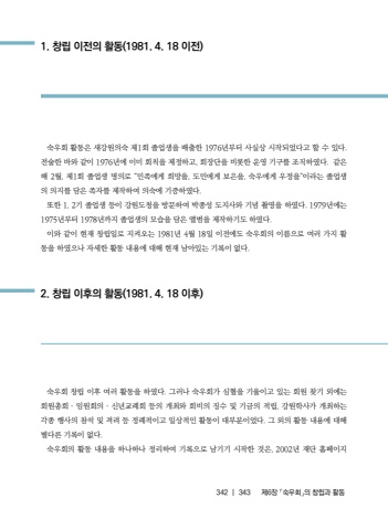342 |343%uc81c6%uc7a5 %u300c%uc219%uc6b0%ud68c%u300d%uc758 %ucc3d%ub9bd%uacfc %ud65c%ub3d9%uc219%uc6b0%ud68c %ud65c%ub3d9%uc740 %uc0c8%uac15%uc6d0%uc758%uc219 %uc81c1%ud68c %uc878%uc5c5%uc0dd%uc744 %ubc30%ucd9c%ud55c 1976%ub144%ubd80%ud130 %uc0ac%uc2e4%uc0c1 %uc2dc%uc791%ub418%uc5c8%ub2e4%uace0 %ud560 %uc218 %uc788%ub2e4. %uc804%uc220%ud55c %ubc14%uc640 %uac19%uc774 1976%ub144%uc5d0 %uc774%ubbf8 %ud68c%uce59%uc744 %uc81c%uc815%ud558%uace0, %ud68c%uc7a5%ub2e8%uc744 %ube44%ub86f%ud55c %uc6b4%uc601 %uae30%uad6c%ub97c %uc870%uc9c1%ud558%uc600%ub2e4. %uac19%uc740 %ud574 2%uc6d4, %uc81c1%ud68c %uc878%uc5c5%uc0dd %uba85%uc758%ub85c %u201c%ubbfc%uc871%uc5d0%uac8c %ud76c%ub9dd%uc744, %ub3c4%ubbfc%uc5d0%uac8c %ubcf4%uc740%uc744, %uc219%uc6b0%uc5d0%uac8c %uc6b0%uc815%uc744%u201d%uc774%ub77c%ub294 %uc878%uc5c5%uc0dd%uc758 %uc758%uc9c0%ub97c %ub2f4%uc740 %uc871%uc790%ub97c %uc81c%uc791%ud558%uc5ec %uc758%uc219%uc5d0 %uae30%uc99d%ud558%uc600%ub2e4.%ub610%ud55c 1, 2%uae30 %uc878%uc5c5%uc0dd %ub4f1%uc774 %uac15%uc6d0%ub3c4%uccad%uc744 %ubc29%ubb38%ud558%uc5ec %ubc15%uc885%uc131 %ub3c4%uc9c0%uc0ac%uc640 %uae30%ub150 %ucd2c%uc601%uc744 %ud558%uc600%ub2e4. 1979%ub144%uc5d0%ub294 1975%ub144%ubd80%ud130 1978%ub144%uae4c%uc9c0 %uc878%uc5c5%uc0dd%uc758 %ubaa8%uc2b5%uc744 %ub2f4%uc740 %uc568%ubc94%uc744 %uc81c%uc791%ud558%uae30%ub3c4 %ud558%uc600%ub2e4.%uc774%uc640 %uac19%uc774 %ud604%uc7ac %ucc3d%ub9bd%uc77c%ub85c %uc9c0%ucf1c%uc624%ub294 1981%ub144 4%uc6d4 18%uc77c %uc774%uc804%uc5d0%ub3c4 %uc219%uc6b0%ud68c%uc758 %uc774%ub984%uc73c%ub85c %uc5ec%ub7ec %uac00%uc9c0 %ud65c%ub3d9%uc744 %ud558%uc600%uc73c%ub098 %uc790%uc138%ud55c %ud65c%ub3d9 %ub0b4%uc6a9%uc5d0 %ub300%ud574 %ud604%uc7ac %ub0a8%uc544%uc788%ub294 %uae30%ub85d%uc774 %uc5c6%ub2e4.%uc219%uc6b0%ud68c %ucc3d%ub9bd %uc774%ud6c4 %uc5ec%ub7ec %ud65c%ub3d9%uc744 %ud558%uc600%ub2e4. %uadf8%ub7ec%ub098 %uc219%uc6b0%ud68c%uac00 %uc2ec%ud608%uc744 %uae30%uc6b8%uc774%uace0 %uc788%ub294 %ud68c%uc6d0 %ucc3e%uae30 %uc678%uc5d0%ub294 %ud68c%uc6d0%ucd1d%ud68c %u302e %uc784%uc6d0%ud68c%uc758 %u302e %uc2e0%ub144%uad50%ub840%ud68c %ub4f1%uc758 %uac1c%ucd5c%uc640 %ud68c%ube44%uc758 %uc9d5%uc218 %ubc0f %uae30%uae08%uc758 %uc801%ub9bd, %uac15%uc6d0%ud559%uc0ac%uac00 %uac1c%ucd5c%ud558%ub294 %uac01%uc885 %ud589%uc0ac%uc758 %ucc38%uc11d %ubc0f %uaca9%ub824 %ub4f1 %uc815%ub840%uc801%uc774%uace0 %uc77c%uc0c1%uc801%uc778 %ud65c%ub3d9%uc774 %ub300%ubd80%ubd84%uc774%uc5c8%ub2e4. %uadf8 %uc678%uc758 %ud65c%ub3d9 %ub0b4%uc6a9%uc5d0 %ub300%ud574 %ubcc4%ub2e4%ub978 %uae30%ub85d%uc774 %uc5c6%ub2e4.%uc219%uc6b0%ud68c%uc758 %ud65c%ub3d9 %ub0b4%uc6a9%uc744 %ud558%ub098%ud558%ub098 %uc815%ub9ac%ud558%uc5ec %uae30%ub85d%uc73c%ub85c %ub0a8%uae30%uae30 %uc2dc%uc791%ud55c %uac83%uc740, 2002%ub144 %uc7ac%ub2e8 %ud648%ud398%uc774%uc9c01. %ucc3d%ub9bd %uc774%uc804%uc758 %ud65c%ub3d9(1981. 4. 18 %uc774%uc804)2. %ucc3d%ub9bd %uc774%ud6c4%uc758 %ud65c%ub3d9(1981. 4. 18 %uc774%ud6c4)