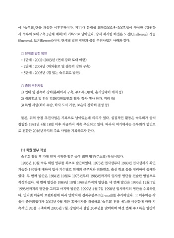 %uc5d0 %u300c%uc219%uc6b0%ud68c%u300d%ub780%uc744 %uac1c%uc124%ud55c %uc774%ud6c4%ubd80%ud130%uc774%ub2e4. %uc81c11%ub300 %ubb38%ud0dc%uc131 %ud68c%uc7a5(2002.5~2007.3)%uc774 %uad6c%uc0c1%ud55c <%uac15%uc6d0%ud559%uc0ac %uc219%uc6b0%ud68c %ud1a0%ub300%uad6c%ucd95 3%ub2e8%uacc4 %uacc4%ud68d>%uc774 %uae30%ub85d%uc73c%ub85c %ub0a8%uc544%uc788%ub2e4. %ub2f9%uc2dc %uc81c%uc2dc%ud55c %ube44%uc804%uc740 %ub3c4%uc804(Challenge), %uc131%uacf5(Success), %ubcf4%uc740(Reward)%uc774%uba70, %ub2e8%uacc4%ubcc4 %ubc1c%uc804 %ubc29%uc548%uacfc %uc911%uc810 %ucd94%uc9c4%uc0ac%uc5c5%uc740 %uc544%ub798%uc640 %uac19%ub2e4.%u25cb %ub2e8%uacc4%ubcc4 %ubc1c%uc804 %ubc29%uc548- 1%ub2e8%uacc4 : 2002~2003%ub144 <%uc5f0%ub300 %uac15%ud654 %ud1a0%ub300 %ub9c8%ub828> - 2%ub2e8%uacc4 : 2004%ub144 <%ub300%uc678%ud64d%ubcf4 %ubc0f %uacb0%uc18d%ub825 %uac15%ud654 %uad6c%ucd95> - 3%ub2e8%uacc4 : 2005%ub144 <%ud798 %uc788%ub294 %uc219%uc6b0%ud68c%ub85c %ubc1c%uc804> %u25cb %uc911%uc810 %ucd94%uc9c4%uc0ac%uc5c51) %uc5f0%ub300 %ubc0f %uacb0%uc18d%ub825 %uac15%ud654(%ud648%ud398%uc774%uc9c0 %uad6c%ucd95, %uc8fc%uc18c%ub85d DB%ud654, %ud648%ucee4%ubc0d%ub370%uc774 %uac1c%ucd5c %ub4f1)2) %ub300%uc678%ud64d%ubcf4 %ubc0f %uc704%uc0c1 %uac15%ud654(%uac15%uc6d0%ub3c4%ubbfc%ud68c %ucc38%uac00, %ud559%uc0ac %ud589%uc0ac %ucc38%uac00, %uaca9%ub824 %ub4f1)3) %ud2b9%ubcc4 %uc0ac%uc5c5(%ud68c%ube44 %uc218%ub0a9, %ud559%uc0ac %ub3c4%uc11c %uae30%uc99d, %ubcf4%uc740%uc758 %uc7a5%ud559%ud68c %uacb0%uc131 %ub4f1)%ubb3c%ub860, %uc704%uc758 %uc911%uc810 %ucd94%uc9c4%uc0ac%uc5c5%uc740 %uae30%ub85d%uc73c%ub85c %ub0a8%uc544%uc788%ub294%ub370 %uc758%uc758%uac00 %uc788%ub2e4. %uc2e4%uc9c8%uc801%uc778 %ud65c%ub3d9%uc740 %uc219%uc6b0%ud68c%uac00 %uacf5%uc2dd %ucc3d%ub9bd%ud55c 1981%ub144 4%uc6d4 18%uc77c %uc774%ud6c4 %uc9c0%uae08%uae4c%uc9c0 %uc9c0%uc18d %ucd94%uc9c4%ub418%uace0 %uc788%ub2e4. %ub530%ub77c%uc11c %uc5ec%uae30%uc5d0%uc11c%ub294 %uc219%uc6b0%ud68c%uac00 %ubc95%uc778%uc73c%ub85c %uc804%ud658%ud55c 2016%ub144%uae4c%uc9c0%uc758 %uc8fc%uc694 %uc0ac%uc5c5%uc744 %uae30%ub85d%ud558%uace0%uc790 %ud55c%ub2e4. (1) %ud68c%uc6d0 %uba85%ubd80 %uc791%uc131%uc219%uc6b0%ud68c %ucc3d%ub9bd %ud6c4 %uac00%uc7a5 %uba3c%uc800 %uc2dc%uc791%ud55c %uc77c%uc740 %uc219%uc6b0 %ud68c%uc6d0 %uba85%ubd80(%uc8fc%uc18c%ub85d) %uc791%uc131%uc774%uc5c8%ub2e4.1983%ub144 10%uc6d4 %uc219%uc6b0 %ud68c%uc6d0 %uba85%ubd80%ub97c %ucd5c%ucd08%ub85c %ubc1c%uac04%ud558%uc600%ub2e4. 1975%ub144 %uc785%uc0ac%uc0dd%ubd80%ud130 1980%ub144 %uc785%uc0ac%uc0dd%uae4c%uc9c0 %ud655%uc778 %uac00%ub2a5%ud55c 149%uba85%uc5d0 %ub300%ud558%uc5ec %uc785%uc0ac %uae30%uc218%ubcc4%ub85c %ud604%uc7ac%uc758 %uadfc%ubb34%ucc98%uc640 %uc804%ud654%ubc88%ud638, %ucd9c%uc2e0 %ud559%uad50 %ub4f1%uc744 %uc815%ub9ac%ud558%uc5ec %ub4f1%uc7ac%ud558%uc600%ub2e4. %ub450 %ubc88%uc9f8 %ubc1c%uac04%uc740 1984%ub144 10%uc6d4%ub85c 1975%ub144%ubd80%ud130 1983%ub144%uae4c%uc9c0%uc758 %uc785%uc0ac%uc0dd %uba85%ub2e8%uc744 %uc804%uc220%ud55c %ubc29%ubc95%uc73c%ub85c %uc791%uc131%ud558%uc600%ub2e4. %uc138 %ubc88%uc9f8 %ubc1c%uac04%uc740 1985%ub144 10%uc6d4 1984%ub144%uae4c%uc9c0%uc758 %uba85%ub2e8%uc744, %ub124 %ubc88%uc9f8 %ubc1c%uac04%uc740 1996%ub144 12%uc6d4 7%uc77c 1993%ub144%uae4c%uc9c0%uc758 %uba85%ub2e8%uc744 %uadf8%ub9ac%uace0 %ub9c8%uc9c0%ub9c9 %ubc1c%uac04%uc740 1999%ub144 4%uc6d4 7%uc77c 1998%ub144 %uc785%uc0ac%uae4c%uc9c0%uc758 %uba85%ub2e8%uc744 %uc218%ub85d%ud558%uc600%ub2e4. %uc778%ud130%ub137 %uc774%uc6a9%uc774 %ubcf4%ud3b8%ud654%ub428%uc5d0 %ub530%ub77c %uc5f0%ub77d%ucc98%uc5d0 %uc804%uc790%uc6b0%ud3b8%uc8fc%uc18c(E-mail)%ub97c %ucd94%uac00%ud558%uc600%ub2e4. %uadf8 %uc774%ud6c4%uc5d0%ub294 %uc791%uc131%uc774 %uc911%ub2e8%ub418%uc5c8%ub2e4%uac00 2002%ub144 9%uc6d4 %uc7ac%ub2e8 %ud648%ud398%uc774%uc9c0%ub97c %uac1c%uc124%ud558%uace0 %u2018%uc219%uc6b0%ud68c%u2019 %uc804%uc6a9 %uba54%ub274%ub97c %ub9c8%ub828%ud568%uc5d0 %ub530%ub77c %uc9c0%uc18d%uc801%uc778 DB%ub97c %uad6c%ucd95%ud558%uc5ec 2005%ub144 7%uc6d4, %uac15%uc6d0%ud559%uc0ac %uc124%ub9bd 30%uc8fc%ub144%uc744 %ub9de%uc774%ud558%uc5ec %uc5ec%uc12f %ubc88%uc9f8 %uc8fc%uc18c%ub85d%uc744 %ubc1c%uac04%ud558