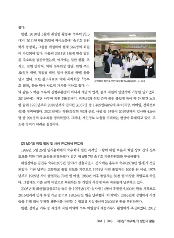 344 |345%uc81c6%uc7a5 %u300c%uc219%uc6b0%ud68c%u300d%uc758 %ucc3d%ub9bd%uacfc %ud65c%ub3d9%uc600%ub2e4.%ud55c%ud3b8, 2010%ub144 3%uc6d4%uc5d0 %ucde8%uc784%ud55c %ud669%ub3d9%uc8fc %uc219%uc6b0%ud68c%uc7a5(13%ub300)%uc774 2011%ub144 9%uc6d4 23%uc77c%uc5d0 %ud398%uc774%uc2a4%ubd81%uc5d0 %u300c%uc219%uc6b0%ud68c %uac15%uc6d0%ud559%uc0ac %ub3d9%ucc3d%ud68c%u300d %uadf8%ub8f9%uc744 %uac1c%uc124%ud558%uc5ec %ud604%uc7ac 564%uba85%uc758 %ud68c%uc6d0%uc774 %uac00%uc785%ub418%uc5b4 %uc788%ub2e4. %uc544%uc6b8%ub7ec 2013%ub144 1%uc6d4%uc5d0 %ud55c%uce35 %ubc1c%uc804%ub41c %uc8fc%uc18c%ub85d%uc744 %ubc1c%uac04%ud558%uc600%ub294%ub370, %uc5ec%uae30%uc5d0%ub294 %uc77c%ubc18 %ud604%ud669, %uc870%uc9c1%ub3c4, %uc784%uc6d0 %uc5f0%ub77d%ucc98, %uc5ed%ub300 %uc219%uc6b0%ud68c%uc7a5 %uba85%ub2e8, %ud68c%uc6d0 %uc8fc%uc18c%ub85d(%uc131%uba85 %uc0c9%uc778, %uc9c1%uc5c5%ubcc4 %uc0c9%uc778, %uc785%uc0ac %uc5f0%ub3c4%ubcc4 %uc0c9%uc778) %ub4f1%uc744 %ub2f4%uace0 %uc788%ub2e4. %ub610%ud55c %ucc38%uace0%uc790%ub8cc%ub85c %uc5ed%ub300 %uc790%uce58%ud68c%uc7a5, %u300e%uc219%uc6b0%ud68c %ud68c%uce59%u300f %ub4f1%uc744 %ub2f4%uc544 %uc0ac%ub8cc%uc801 %uac00%uce58%ub97c %ub354%ud558%uace0 %uc788%ub2e4. %uc774%uc640 %uac19%uc740 %ub178%ub825%uc740 %uc219%uc6b0%ud68c %uc9d1%ud589%ubd80%ubfd0%ub9cc%uc774 %uc544%ub2c8%ub77c %uc7ac%ub2e8%uc758 %uc778%uc801, %ubb3c%uc801 %uc9c0%uc6d0%uc774 %uc788%uc5c8%uae30%uc5d0 %uac00%ub2a5%ud55c %uc77c%uc774%uc5c8%ub2e4. 2016%ub144%uc5d0%ub294 %uc7ac%ub2e8 %uc0ac%ubb34%uad6d %uc9c1%uc6d0 2%uba85(%uae40%ubcd1%uae30, %ubc15%uc885%uc6b4)%uacfc %ucde8%uc5c5 %uc900%ube44 %uc911%uc778 %uc878%uc5c5%uc0dd %ub4f1%uc774 %uc57d %ud55c %ub2ec%uac04 %ub178%ub825%ud55c %ub05d%uc5d0 1975%ub144%ubd80%ud130 2010%ub144%uae4c%uc9c0 %uc785%uc0ac%ud55c 3,057%uba85 %uc911 1,489%uba85(48%)%uc758 %uc8fc%uc18c(%uc9c1%uc7a5, %uc774%uba54%uc77c, %uc804%ud654%ubc88%ud638 %ub4f1)%ub97c %uc815%ube44%ud558%uc600%ub2e4. 2021%ub144%uc5d0%ub294 %uc9c1%uc6d0(%uc815%uc0c1%ud604 %ub4f1)%uacfc %uadfc%ub85c %uc0ac%uc0dd %ub4f1 15%uba85%uc774 2019%ub144%uae4c%uc9c0 %uc785%uc0ac%ud55c 4,644%uba85 %uc911 994%uba85%uc758 %uc8fc%uc18c%ub85d%uc744 %uc815%ube44%ud558%uc600%ub2e4. %uadf8%ub7ec%ub098, %uac1c%uc778%uc815%ubcf4 %ub178%ucd9c%uc744 %uae30%ud53c%ud558%ub294 %ud604%uc0c1%uc774 %ud655%ub300%ub418%uace0 %uc788%uc5b4, %uc8fc%uc18c%ub85d %uc815%ube44%uac00 %uc5b4%ub824%uc6b4 %uc2e4%uc815%uc774%ub2e4.(2) %ubcf4%uc740%uc758 %uc7a5%ud559 %ud65c%ub3d9 %ubc0f %uc0ac%uc0dd %uc9c4%ub85c%ud0d0%uc0c9 %uba58%ud1a0%ub9c11989%ub144 5%uc6d4 26%uc77c %uc784%uc2dc%ucd1d%ud68c%uc5d0%uc11c %uc219%uc6b0%ud68c%uc758 %uc124%ub9bd %ubaa9%uc801%uc778 %uace0%ud5a5%uc5d0 %ub300%ud55c %ubcf4%uc740%uacfc %ud68c%uc6d0 %uc0c1%ud638 %uac04%uc758 %uce5c%ubaa9 %ub3c4%ubaa8%ub97c %uc704%ud55c %uae30%uae08 %uc870%uc131%uc744 %uc758%uacb0%ud558%uc600%ub2e4. %uac19%uc740 %ud574 6%uc6d4 7%uc77c %uc219%uc6b0%ud68c %uae30%uae08%uc704%uc6d0%ud68c%ub97c %uad6c%uc131%ud558%uc600%ub2e4.%uc704%uc6d0%uc7a5%uc5d0%ub294 %uae40%uac74%uc6b0 %uc219%uc6b0(1975%ub144 %uc785%uc0ac)%uac00 %uc120%ucd9c%ub418%uc5c8%uace0, %uac04%uc0ac%uc5d0%ub294 %ud64d%ub450%ud45c %uc219%uc6b0(1978%ub144 %uc785%uc0ac)%uac00 %uc120%uc784%ub418%uc5c8%ub2e4. %uae30%uae08 %ub0a9%ubd80%ub294 %uace0%ub4f1%ud559%uad50 %uc878%uc5c5 %uc5f0%ub3c4%ub97c %uae30%uc900%uc73c%ub85c 1974%ub144 %uc774%uc804 %uc878%uc5c5%uc790%ub294 100%ucc9c %uc6d0 %uc774%uc0c1, 1975%ub144%ubd80%ud130 1989%ub144 %uc0ac%uc774 %uc878%uc5c5%uc790%ub294 70%ucc9c %uc6d0 %uc774%uc0c1, 1980%ub144 %uc774%ud6c4 %uc878%uc5c5%uc790%ub294 50%ucc9c %uc6d0 %uc774%uc0c1%uc744 %uc801%ub9bd%ud1a0%ub85d %ud558%uc600%ub2e4. %uadf8%ub7fc%uc5d0%ub3c4 %uae30%uc900 %uae08%uc561 %uc774%uc0c1%uc73c%ub85c %ud6c4%uc6d0%ud558%ub294 %ub4f1 %uac1c%uc778%uc758 %uc0ac%uc815%uc5d0 %ub530%ub77c %uc790%uc720%ub86d%uac8c %ub0a9%ubd80%ud558%uace0 %uc788%ub2e4. 2005%ub144%uc5d0 %ucd5c%uc120%uc9d1(%uac15%ub989%uace074) %uc219%uc6b0 %ub4f1 1975%ub144(1%uae30) %uc785%uc0ac%uc0dd 14%uba85%uc774 %ud6c4%uc6d0%ud55c 5,000%ucc9c %uc6d0%uc744 %uc2dc%uc791%uc73c%ub85c 2016%ub144%uae4c%uc9c0 %uc778%uc7ac %uc721%uc131 %uae30%uae08 %ub4f1%uc73c%ub85c 159,647%ucc9c %uc6d0%uc744 %ub0a9%ubd80%ud588%ub2e4. %uc774 %ubc16%uc5d0%ub3c4 2016%ub144%uc5d0 %uac15%uc6d0%ud559%uc0ac %uc0ac%uc0dd%ub4e4%uc744 %uc704%ud574 %ucc45%uc0c1 %ubd80%ucc29%ud615 %ucc45%uaf42%uc774%ub97c %ub9c8%ub828%ud560 %uc218 %uc788%ub3c4%ub85d %uc2dc%uc124%uac1c%uc120%ube44 20,000%ucc9c %uc6d0%uc744 %ud6c4%uc6d0%ud558%uc600%ub2e4.%ud55c%ud3b8, %uc7a5%ud559%uae08 %uae30%ubd80 %ub4f1 %uc7ac%uc815%uc801 %uc9c0%uc6d0 %uc774%uc678%uc5d0 %uc219%uc6b0 %ud68c%uc6d0%ub4e4%uc758 %uc7ac%ub2a5%uae30%ubd80%ub3c4 %ud65c%ubc1c%ud558%uac8c %ucd94%uc9c4%ud558%uc600%ub2e4. 2012%uac15%uc6d0%ud559%uc0ac %ubc1c%uc804%uc744 %uc704%ud55c %uc219%uc6b0%ud68c %uc6cc%ud06c%uc20d(2011. 9. 20.)