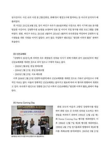 %ub150%uc0ac%uc9c4%uc774%ub2e4. %uc0ac%uc9c4 %uc18d%uc758 %uc0ac%uc0dd %uc911 2%uba85(%uae40%ud68c%uc131, %ucd5c%ud61c%uc9c0)%uc774 %ud589%uc815%uace0%uc2dc%uc5d0 %ud569%uaca9%ud558%ub294 %ub4f1 %ub2e4%uc218%uc758 %uacf5%uc9c1%uc790%uac00 %ubc30%ucd9c%ub418%uc5c8%ub2e4.%uc704 %uc0ac%uc9c4%uc740 2012%ub144 8%uc6d4 3%uc77c, %ub2f9%uc2dc %ud5c8%uc778%uad6c %uc219%uc6b0%uac00 SBS%uace8%ud504%ucc44%ub110 %uc0ac%uc7a5%uc73c%ub85c %uc7ac%uc9c1 %uc2dc%uae30%uc5d0 SBS %ubcf8%uc0ac%ub97c %ubc29%ubb38%ud55c %uc0ac%uc9c4%uc774%ub2e4. %uac15%uc6d0%ud559%uc0ac%uc0dd 40%uba85%uc744 %ucd08%uccad%ud558%uc5ec %uc5b8%ub860 %ubc0f %ubbf8%ub514%uc5b4 %uc9c1%uc5c5 %ud0d0%uad6c%ub97c %uc704%ud55c %ud504%ub85c%uadf8%ub7a8%uc744 %uc9c4%ud589%ud558%uc600%ub2e4. %ud55c%ud3b8, %ud5c8%uc778%uad6c %uc219%uc6b0%ub294 2013%ub144 4%uc6d4%ubd80%ud130 2016%ub144 4%uc6d4%uae4c%uc9c0 %uc219%uc6b0%ud68c%uc7a5%uc744 %uc5ed%uc784%ud558%uba70 %uac15%uc6d0%ud559%uc0ac %ubc0f %uc0ac%uc0dd%ub4e4%uc744 %uc704%ud55c %uc9c0%uc6d0%uc744 %uc544%ub07c%uc9c0 %uc54a%uc558%ub2e4. %ubcf4%ub2e4 %ub9ce%uc740 %uc9c1%uc5c5%ud0d0%uad6c %uba58%ud1a0%ub9c1%uc740 %u201c%ubc95%uc778%ud654 %uc774%ud6c4%uc758 %ud65c%ub3d9%u201d %ud3b8%uc5d0%uc11c %ud6c4%uc220%ud55c%ub2e4.(3) %uc2e0%ub144%uad50%ub840%ud68c %u300c%uac15%uc6d0%ud559%uc0ac 30%ub144%uc0ac%u300d%uc5d0 %uc758%ud558%uba74 %uc219%uc6b0 %ud68c%uc6d0%ub4e4%uc758 %uce5c%ubaa9%uc744 %ub2e4%uc9c0%uae30 %uc704%ud574 %uc544%ub798%uc640 %uac19%uc774 2003%ub144%ubd80%ud130 %ub9e4%ub144 %uc2e0%ub144%uad50%ub840%ud68c%ub97c %uac1c%ucd5c%ud55c %uac83%uc73c%ub85c %ub418%uc5b4 %uc788%uc73c%ub098 %uad6c%uccb4%uc801 %uc790%ub8cc%ub294 %uc5c6%ub2e4.- 2003%ub144 2%uc6d4 8%uc77c, %uc7a0%uc2e4 %ub86f%ub370%ud638%ud154- 2004%ub144 2%uc6d4 21%uc77c, %uc7a0%uc2e4 %ub86f%ub370%ud638%ud154- 2005%ub144 2%uc6d4 25%uc77c, %uc11c%ucd08 %ubca0%ud1a0%ubca4%uc774%ud6c4 2006%ub144 2%uc6d4 25%uc77c %uac15%uc6d0%ud559%uc0ac(%uad00%uc545)%uc5d0%uc11c %uc2e0%ub144%uad50%ub840%ud68c%ub97c %uac1c%ucd5c%ud55c %uac83%uc73c%ub85c %uae30%ub85d%uc774 %ub0a8%uc544%uc788%uc73c%ub098 %uad6c%uccb4%uc801%uc778 %uc790%ub8cc%ub294 %uc5c6%ub2e4. %uc544%uc6b8%ub7ec %uc815%ub840%uc801%uc778 %uc2e0%ub144%uad50%ub840%ud68c%ub294 %uc5c6%uc5b4%uc9c0%uace0 %ud544%uc694%uc5d0 %ub530%ub77c %ud0c0 %ud589%uc0ac%uc640 %ubcd1%ud589%ud558%uc5ec %uac1c%ucd5c%ub418%uace0 %uc788%ub2e4. %uc219%uc6b0%ud68c%uac00 %ubc95%uc778%uc73c%ub85c %uc804%ud658%ud55c 2017%ub144 %uc774%ud6c4%uc758 %uc2e0%ub144%uad50%ub840%ud68c%ub294%u300c%ubc95%uc778%ud654 %uc774%ud6c4%uc758 %ud65c%ub3d9%u300d%ud3b8%uc5d0%uc11c %ud6c4%uc220%ud55c%ub2e4.(4) Home Coming Day%ud68c%uc6d0 %ubaa8%ub450%uc758 %ub9c8%uc74c%uc758 %uace0%ud5a5%uc778 %uac15%uc6d0%ud559%uc0ac%ub97c %ubc29%ubb38%ud558%uc5ec %ud68c%uc6d0 %uc0c1%ud638 %uac04 %uc6b0%uc758%uc640 %uce5c%ubaa9%uc744 %ub3c4%ubaa8%ud558%uace0 %uc7ac%uc0ac%uc0dd%ub4e4%uc744 %uaca9%ub824%ud558%uae30 %uc704%ud558%uc5ec 1994%ub144 12%uc6d4 4%uc77c %uc81c1%ud68c Home Coming Day %ud589%uc0ac%ub97c %uac1c%ucd5c%ud558%uc600%ub2e4. %uc774%ud6c4 1996%ub144 12%uc6d4 7%uc77c %uc81c2%ud68c %ud589%uc0ac%ub97c %uac1c%ucd5c%ud558%uc600%uace0, 1999%ub144 4%uc6d4 17%uc77c %uc815%uae30%ucd1d%ud68c%uc640 %ubcd1%ud589%ud558%uc5ec %uc81c3%ud68c %ud589%uc0ac%ub97c %uac1c%ucd5c(49%uba85 %ucc38%uc11d)%ud558%uc600%ub2e4. 2005%ub144 5%uc6d4 21%uc77c %u6545%ubc15%uc885%uc131 %ucd08%ub300 %uc774%uc0ac%uc7a5(19%ub300 %uac15%uc6d0%ub3c4%uc9c0%uc0ac) %ud749%uc0c1%uc81c%ub9c9%uc2dd