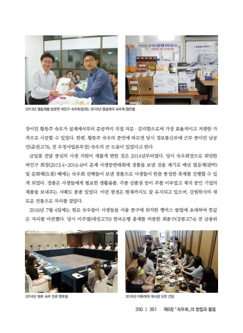 350 |351%uc81c6%uc7a5 %u300c%uc219%uc6b0%ud68c%u300d%uc758 %ucc3d%ub9bd%uacfc %ud65c%ub3d9%uc7a5%uc774%ub358 %ud669%ub3d9%uc8fc %uc219%uc6b0%uac00 %uc124%uacc4%uc5d0%uc11c%ubd80%ud130 %uc900%uacf5%uae4c%uc9c0 %uc9c1%uc811 %uc790%ubb38 %u302e %uac10%ub9ac%ud568%uc73c%ub85c%uc368 %uac00%uc7a5 %ud6a8%uc728%uc801%uc774%uace0 %uc800%ub834%ud55c %uac00%uaca9%uc73c%ub85c %uc2dc%uacf5%ud560 %uc218 %uc788%uc5c8%ub2e4. %ud55c%ud3b8, %ud669%ub3d9%uc8fc %uc219%uc6b0%uc758 %uc99d%uc5b8%uc5d0 %ub530%ub974%uba74 %ub2f9%uc2dc %uc815%ubcf4%ud1b5%uc2e0%ubd80%uc5d0 %uadfc%ubb34 %uc911%uc774%ub358 %ub0a8%uad81%ubbfc(%ucd98%ucc9c%uace076, %uc804 %uc6b0%uc815%uc0ac%uc5c5%ubcf8%ubd80%uc7a5) %uc219%uc6b0%uc758 %ud070 %ub3c4%uc6c0%uc774 %uc788%uc5c8%ub2e4%uace0 %ud55c%ub2e4.%uae08%uc77c%ubd09 %uc804%ub2ec %uc911%uc2ec%uc758 %uc0ac%uc0dd %uc9c0%uc6d0%uc774 %uc0c8%ub86d%uac8c %ubcc0%ud55c %uac83%uc740 2014%ub144%ubd80%ud130%uc600%ub2e4. %ub2f9%uc2dc %uc219%uc6b0%ud68c%uc7a5%uc73c%ub85c %ucde8%uc784%ud55c %ud5c8%uc778%uad6c %ud68c%uc7a5(2013.4~2016.4)%uc774 %ucd98%uacc4 %uc0ac%uc0dd%ub4f1%ubc18%ub300%ud68c%uc5d0 %uacbd%ud488%uc744 %ubcf4%ub0b8 %uac83%uc744 %uacc4%uae30%ub85c %ub9e4%ub144 %uc5f4%uc74c%uc81c(%uad00%uc545) %ubc0f %ubb38%ud654%uc81c(%ub3c4%ubd09) %ub54c%uc5d0%ub294 %uc219%uc6b0%ud68c %uc120%ubc30%ub4e4%uc774 %ubcf4%ub0b8 %uacbd%ud488%uc73c%ub85c %uc0ac%uc0dd%ub4e4%uc774 %ud55c%uce35 %ud48d%uc131%ud55c %ucd95%uc81c%ub97c %uc9c4%ud589%ud560 %uc218 %uc788%uac8c %ub418%uc5c8%ub2e4. %uacbd%ud488%uc740 %uc0ac%uc0dd%ub4e4%uc5d0%uac8c %ud544%uc694%ud55c %uc0dd%ud65c%uc6a9%ud488, %uac01%uc885 %uc0c1%ud488%uad8c %ub4f1%uc774 %uc8fc%ub97c %uc774%ub8e8%uc5c8%uace0 %uc7ac%uc9c1 %uc911%uc778 %uae30%uc5c5%uc758 %uc81c%ud488%uc744 %ubcf4%ub0b4%uc8fc%ub294 %uc0ac%ub840%ub3c4 %uc885%uc885 %uc788%uc5c8%ub2e4. %uc774%ub7f0 %uad11%uacbd%uc740 %ud604%uc7ac%uae4c%uc9c0%ub3c4 %uc798 %uc720%uc9c0%ub418%uace0 %uc788%uc73c%uba70, %uac15%uc6d0%ud559%uc0ac%uc758 %uc0c8%ub85c%uc6b4 %uc804%ud1b5%uc73c%ub85c %uc790%ub9ac%ub97c %uc7a1%uc558%ub2e4.2016%ub144 7%uc6d4 4%uc77c%uc5d0%ub294 %uc6d0%ub85c %uc219%uc6b0%ub4e4%uc774 %uc0ac%uc0dd%ub4e4%uc744 %uc11c%uc6b8 %uc911%uad6c%uc5d0 %uc704%uce58%ud55c %ubc45%ucee4%uc2a4 %ud074%ub7fd%uc5d0 %ucd08%ub300%ud558%uc5ec %ub73b%uae4a%uc740 %uc790%ub9ac%ub97c %ub9c8%ub828%ud588%ub2e4. %ub2f9%uc2dc %uc774%uc8fc%uc5f4(%ub300%uc131%uace070) %ud55c%uad6d%uc740%ud589 %ucd1d%uc7ac%ub97c %ube44%ub86f%ud55c %ucd5c%uc885%uad6c(%uac15%ub989%uace074) %uc804 %uae08%uc735%uc7042013%ub144 %uc5f4%uc74c%uc81c%ub97c %ubc29%ubb38%ud55c %ud5c8%uc778%uad6c %uc219%uc6b0%ud68c%uc7a5(%uc88c), 2019%ub144 %uc5f4%uc74c%uc81c%uc758 %uc219%uc6b0%ud68c %ud611%ucc2c%ud4882016%ub144 %uc6d0%ub85c %uc219%uc6b0 %uc9c4%ub85c %uba58%ud1a0%ub9c12016%ub144 %uc774%ud654%uc5ec%ub300 %uc7ac%uc0ac%uc0dd %uc624%ucc2c %uac04%ub2f4