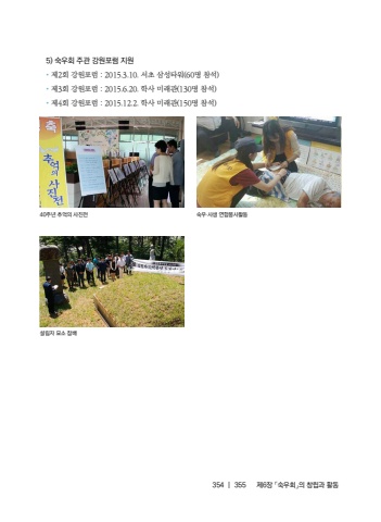 354 |355%uc81c6%uc7a5 %u300c%uc219%uc6b0%ud68c%u300d%uc758 %ucc3d%ub9bd%uacfc %ud65c%ub3d95) %uc219%uc6b0%ud68c %uc8fc%uad00 %uac15%uc6d0%ud3ec%ub7fc %uc9c0%uc6d0%u2022 %uc81c2%ud68c %uac15%uc6d0%ud3ec%ub7fc : 2015.3.10. %uc11c%ucd08 %uc0bc%uc131%ud0c0%uc6cc(60%uba85 %ucc38%uc11d)%u2022 %uc81c3%ud68c %uac15%uc6d0%ud3ec%ub7fc : 2015.6.20. %ud559%uc0ac %ubbf8%ub798%uad00(130%uba85 %ucc38%uc11d)%u2022 %uc81c4%ud68c %uac15%uc6d0%ud3ec%ub7fc : 2015.12.2. %ud559%uc0ac %ubbf8%ub798%uad00(150%uba85 %ucc38%uc11d)40%uc8fc%ub144 %ucd94%uc5b5%uc758 %uc0ac%uc9c4%uc804%uc124%ub9bd%uc790 %ubb18%uc18c %ucc38%ubc30%uc219%uc6b0%u00b7%uc0ac%uc0dd %uc5f0%ud569%ubd09%uc0ac%ud65c%ub3d9
