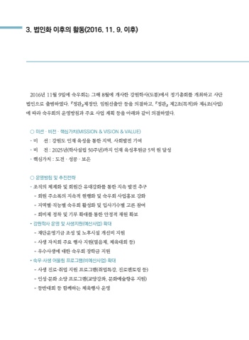 2016%ub144 11%uc6d4 9%uc77c%uc5d0 %uc219%uc6b0%ud68c%ub294 %uadf8%ud574 8%uc6d4%uc5d0 %uac1c%uc0ac%ud55c %uac15%uc6d0%ud559%uc0ac(%ub3c4%ubd09)%uc5d0%uc11c %uc815%uae30%ucd1d%ud68c%ub97c %uac1c%ucd5c%ud558%uace0 %uc0ac%ub2e8%ubc95%uc778%uc73c%ub85c %ucd9c%ubc94%ud558%uc600%ub2e4. %u300e%uc815%uad00%u300f%uc81c%uc815%uc548, %uc784%uc6d0%uc120%ucd9c%uc548 %ub4f1%uc744 %uc758%uacb0%ud558%uace0, %u300e%uc815%uad00%u300f %uc81c2%uc870(%ubaa9%uc801)%uc640 %uc81c4%uc870(%uc0ac%uc5c5)%uc5d0 %ub530%ub77c %uc219%uc6b0%ud68c%uc758 %uc6b4%uc601%ubc29%uce68%uacfc %uc8fc%uc694 %uc0ac%uc5c5 %uacc4%ud68d %ub4f1%uc744 %uc544%ub798%uc640 %uac19%uc774 %uc758%uacb0%ud558%uc600%ub2e4.%u25cb %ubbf8%uc158 %u00b7 %ube44%uc804 %u00b7 %ud575%uc2ec%uac00%uce58(MISSION & VISION & VALUE)%u2022 %ubbf8 %uc158 : %uac15%uc6d0%ub3c4 %uc778%uc7ac %uc721%uc131%uc744 %ud1b5%ud55c %uc9c0%uc5ed, %uc0ac%ud68c%ubc1c%uc804 %uae30%uc5ec%u2022 %ube44 %uc804 : 2025%ub144(%ud559%uc0ac%uc124%ub9bd 50%uc8fc%ub144)%uae4c%uc9c0 %uc778%uc7ac %uc721%uc131%ud6c4%uc6d0%uae08 5%uc5b5 %uc6d0 %ub2ec%uc131 %u2022 %ud575%uc2ec%uac00%uce58 : %ub3c4%uc804 %u00b7 %uc131%uacf5 %u00b7 %ubcf4%uc740%u25cb %uc6b4%uc601%ubc29%uce68 %ubc0f %ucd94%uc9c4%uc804%ub7b5%u2022 %uc870%uc9c1%uc758 %uccb4%uacc4%ud654 %ubc0f %ud68c%uc6d0%uac04 %uc720%ub300%uac15%ud654%ub97c %ud1b5%ud55c %uc9c0%uc18d %ubc1c%uc804 %ucd94%uad6c- %ud68c%uc6d0 %uc8fc%uc18c%ub85d%uc758 %uc9c0%uc18d%uc801 %ud604%ud589%ud654 %ubc0f %uc219%uc6b0%ud68c %uc0ac%uc5c5%ud64d%ubcf4 %uac15%ud654- %uc9c0%uc5ed%ubcc4%u00b7%uc9c1%ub2a5%ubcc4 %uc219%uc6b0%ud68c %ud65c%uc131%ud654 %ubc0f %uc785%uc0ac%uae30%uc218%ubcc4 %uace0%ub978 %ucc38%uc5ec - %ud68c%ube44%uc81c %uc815%ucc29 %ubc0f %uae30%ubd80 %ud655%ub300%ub97c %ud1b5%ud55c %uc548%uc815%uc801 %uc7ac%uc6d0 %ud655%ubcf4%u2022%uac15%uc6d0%ud559%uc0ac %uc6b4%uc601 %ubc0f %uc0ac%uc0dd%uc9c0%uc6d0(%uc608%uc0b0%uc0ac%uc5c5) %ud655%ub300- %uc7ac%ub2e8%uc6b4%uc601%uae30%uae08 %uc870%uc131 %ubc0f %ub178%ud6c4%uc2dc%uc124 %uac1c%uc120%ube44 %uc9c0%uc6d0- %uc0ac%uc0dd %uc790%uce58%ud68c %uc8fc%uc694 %ud589%uc0ac %uc9c0%uc6d0(%uc5f4%uc74c%uc81c, %uccb4%uc721%ub300%ud68c %ub4f1)- %uc6b0%uc218%uc0ac%uc0dd%uc5d0 %ub300%ud55c %uc219%uc6b0%ud68c %uc7a5%ud559%uae08 %uc9c0%uc6d0%u2022 %uc219%uc6b0%u00b7%uc0ac%uc0dd %uc5b4%uc6b8%ub9bc %ud504%ub85c%uadf8%ub7a8(%ube44%uc608%uc0b0%uc0ac%uc5c5) %ud655%ub300- %uc0ac%uc0dd %uc9c4%ub85c%u00b7%ucde8%uc5c5 %uc9c0%uc6d0 %ud504%ub85c%uadf8%ub7a8(%ucde8%uc5c5%ud2b9%uac15, %uc9c4%ub85c%uba58%ud1a0%ub9c1 %ub4f1)- %uc778%uc131%u00b7%ubb38%ud654 %uc18c%uc591 %ud504%ub85c%uadf8%ub7a8(%uad50%uc591%uac15%uc88c, %ubb38%ud654%uc608%uc220%ud5a5%uc720 %uc9c0%uc6d0)- %ub4f1%ubc18%ub300%ud68c %ub4f1 %ud568%uaed8%ud558%ub294 %uccb4%uc721%ud589%uc0ac %uc6b4%uc6013. %ubc95%uc778%ud654 %uc774%ud6c4%uc758 %ud65c%ub3d9(2016. 11. 9. %uc774%ud6c4)