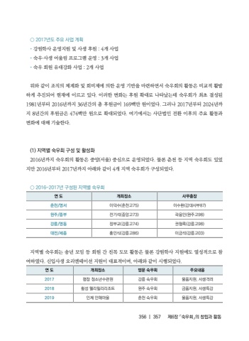 356 |357%uc81c6%uc7a5 %u300c%uc219%uc6b0%ud68c%u300d%uc758 %ucc3d%ub9bd%uacfc %ud65c%ub3d9%u25cb 2017%ub144%ub3c4 %uc8fc%uc694 %uc0ac%uc5c5 %uacc4%ud68d%u2022 %uac15%uc6d0%ud559%uc0ac %uc6b4%uc601%uc9c0%uc6d0 %ubc0f %uc0ac%uc0dd %ud6c4%uc6d0 : 4%uac1c %uc0ac%uc5c5%u2022 %uc219%uc6b0%u00b7%uc0ac%uc0dd %uc5b4%uc6b8%ub9bc %ud504%ub85c%uadf8%ub7a8 %uc6b4%uc601 : 3%uac1c %uc0ac%uc5c5%u2022 %uc219%uc6b0 %ud68c%uc6d0 %uc720%ub300%uac15%ud654 %uc0ac%uc5c5 : 2%uac1c %uc0ac%uc5c5%uc704%uc640 %uac19%uc774 %uc870%uc9c1%uc758 %uccb4%uacc4%ud654 %ubc0f %ud68c%ube44%uc81c%uc5d0 %uc758%ud55c %uc6b4%uc601 %uae30%ubc18%uc744 %ub9c8%ub828%ud558%uba74%uc11c %uc219%uc6b0%ud68c%uc758 %ud65c%ub3d9%uc740 %ube44%uad50%uc801 %ud65c%ubc1c%ud558%uac8c %ucd94%uc9c4%ub418%uc5b4 %ud604%uc7ac%uc5d0 %uc774%ub974%uace0 %uc788%ub2e4. %uc774%ub7ec%ud55c %ubcc0%ud654%ub294 %ud6c4%uc6d0 %ud655%ub300%ub85c %ub098%ud0c0%ub0ac%ub294%ub370 %uc219%uc6b0%ud68c%uac00 %ucd5c%ucd08 %uacb0%uc131%ub41c 1981%ub144%ubd80%ud130 2016%ub144%uae4c%uc9c0 36%ub144%uac04%uc758 %ucd1d %ud6c4%uc6d0%uae08%uc774 169%ubc31%ub9cc %uc6d0%uc774%uc5c8%ub2e4. %uadf8%ub7ec%ub098 2017%ub144%ubd80%ud130 2024%ub144%uae4c%uc9c0 8%ub144%uac04%uc758 %ud6c4%uc6d0%uae08%uc740 474%ubc31%ub9cc %uc6d0%uc73c%ub85c %ud655%ub300%ub418%uc5c8%ub2e4. %uc5ec%uae30%uc5d0%uc11c%ub294 %uc0ac%ub2e8%ubc95%uc778 %uc804%ud658 %uc774%ud6c4%uc758 %uc8fc%uc694 %ud65c%ub3d9%uacfc %ubcc0%ud654%uc5d0 %ub300%ud574 %uae30%uc220%ud55c%ub2e4.(1) %uc9c0%uc5ed%ubcc4 %uc219%uc6b0%ud68c %uad6c%uc131 %ubc0f %ud65c%uc131%ud6542016%ub144%uae4c%uc9c0 %uc219%uc6b0%ud68c%uc758 %ud65c%ub3d9%uc740 %uc911%uc559(%uc11c%uc6b8) %uc911%uc2ec%uc73c%ub85c %uc6b4%uc601%ub418%uc5c8%ub2e4. %ubb3c%ub860 %ucd98%ucc9c %ub4f1 %uc9c0%uc5ed %uc219%uc6b0%ud68c%ub3c4 %uc788%uc5c8%uc9c0%ub9cc 2016%ub144%ubd80%ud130 2017%ub144%uae4c%uc9c0 %uc544%ub798%uc640 %uac19%uc774 4%uac1c %uc9c0%uc5ed %uc219%uc6b0%ud68c%uac00 %uad6c%uc131%ub418%uc5c8%ub2e4.%u25cb 2016~2017%ub144 %uad6c%uc131%ub41c %uc9c0%uc5ed%ubcc4 %uc219%uc6b0%ud68c%uc5f0 %ub3c4%uac1c%ucd5c%uc7a5%uc18c%uc0ac%ubb34%ucd1d%uc7a5%ucd98%ucc9c/%uc601%uc11c%uc774%ub355%uc218(%ucd98%ucc9c%uace075)%uc774%uc218%ud658(%uac15%ub300%uc0ac%ubd8087)%uc6d0%uc8fc/%uc911%ubd80%uc804%uae30%uc11d(%uc911%uc559%uace073)%uacfd%uc6a9%ubbfc(%uc6d0%uc8fc%uace098)%uac15%ub989/%uc601%ub3d9%uc815%ubd80%uad50(%uac15%ub989%uace074)%uad8c%ud615%ub85d(%uac15%ub989%uace098)%ub300%uc804/%uc138%uc885%ud64d%ubbfc%uc2dd(%uac15%ub989%uace086)%uc774%uae08%uc11d(%uac15%ub989%uace003)%uc9c0%uc5ed%ubcc4 %uc219%uc6b0%ud68c%ub294 %uc1a1%ub144 %ubaa8%uc784 %ub4f1 %ud68c%uc6d0 %uac04 %uce5c%ubaa9 %ub3c4%ubaa8 %ud65c%ub3d9%uc740 %ubb3c%ub860 %uac15%uc6d0%ud559%uc0ac %uc9c0%uc6d0%uc5d0%ub3c4 %uc5f4%uc131%uc801%uc73c%ub85c %ucc38%uc5ec%ud558%uc600%ub2e4. %uc2e0%uc785%uc0ac%uc0dd %uc624%ub9ac%uc5d4%ud14c%uc774%uc158 %uc9c0%uc6d0%uc774 %ub300%ud45c%uc801%uc774%uba70, %uc544%ub798%uc640 %uac19%uc774 %uc2dc%ud589%ub418%uc5c8%ub2e4. %uc5f0 %ub3c4%uac1c%ucd5c%uc7a5%uc18c%ubc29%ubb38 %uc219%uc6b0%ud68c%uc8fc%uc694%ub0b4%uc6a92017%ud3c9%ucc3d %uccad%uc18c%ub144%uc218%ub828%uc6d0%uac15%ub989 %uc219%uc6b0%ud68c%ubb3c%ud488%uc9c0%uc6d0, %uc0ac%uc0dd%uaca9%ub824 2018%ud6a1%uc131 %uc6f0%ub9ac%ud790%ub9ac%ub9ac%uc870%ud2b8%uc6d0%uc8fc %uc219%uc6b0%ud68c%uae08%ud488%uc9c0%uc6d0, %uc0ac%uc0dd%ud2b9%uac15 2019%uc778%uc81c %ub9cc%ud574%ub9c8%uc744%ucd98%ucc9c %uc219%uc6b0%ud68c%ubb3c%ud488%uc9c0%uc6d0, %uc0ac%uc0dd%ud2b9%uac15