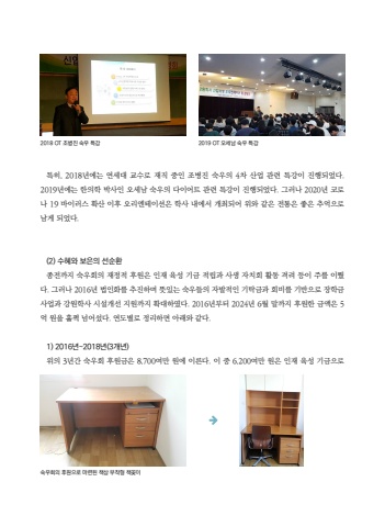 %ud2b9%ud788, 2018%ub144%uc5d0%ub294 %uc5f0%uc138%ub300 %uad50%uc218%ub85c %uc7ac%uc9c1 %uc911%uc778 %uc870%ubcd1%uc9c4 %uc219%uc6b0%uc758 4%ucc28 %uc0b0%uc5c5 %uad00%ub828 %ud2b9%uac15%uc774 %uc9c4%ud589%ub418%uc5c8%ub2e4. 2019%ub144%uc5d0%ub294 %ud55c%uc758%ud559 %ubc15%uc0ac%uc778 %uc624%uc138%ub0a8 %uc219%uc6b0%uc758 %ub2e4%uc774%uc5b4%ud2b8 %uad00%ub828 %ud2b9%uac15%uc774 %uc9c4%ud589%ub418%uc5c8%ub2e4. %uadf8%ub7ec%ub098 2020%ub144 %ucf54%ub85c%ub098 19 %ubc14%uc774%ub7ec%uc2a4 %ud655%uc0b0 %uc774%ud6c4 %uc624%ub9ac%uc5d4%ud14c%uc774%uc158%uc740 %ud559%uc0ac %ub0b4%uc5d0%uc11c %uac1c%ucd5c%ub418%uc5b4 %uc704%uc640 %uac19%uc740 %uc804%ud1b5%uc740 %uc88b%uc740 %ucd94%uc5b5%uc73c%ub85c %ub0a8%uac8c %ub418%uc5c8%ub2e4.(2) %uc218%ud61c%uc640 %ubcf4%uc740%uc758 %uc120%uc21c%ud658 %uc885%uc804%uae4c%uc9c0 %uc219%uc6b0%ud68c%uc758 %uc7ac%uc815%uc801 %ud6c4%uc6d0%uc740 %uc778%uc7ac %uc721%uc131 %uae30%uae08 %uc801%ub9bd%uacfc %uc0ac%uc0dd %uc790%uce58%ud68c %ud65c%ub3d9 %uaca9%ub824 %ub4f1%uc774 %uc8fc%ub97c %uc774%ub918%ub2e4. %uadf8%ub7ec%ub098 2016%ub144 %ubc95%uc778%ud654%ub97c %ucd94%uc9c4%ud558%uba70 %ub73b%uc788%ub294 %uc219%uc6b0%ub4e4%uc758 %uc790%ubc1c%uc801%uc778 %uae30%ud0c1%uae08%uacfc %ud68c%ube44%ub97c %uae30%ubc18%uc73c%ub85c %uc7a5%ud559%uae08 %uc0ac%uc5c5%uacfc %uac15%uc6d0%ud559%uc0ac %uc2dc%uc124%uac1c%uc120 %uc9c0%uc6d0%uae4c%uc9c0 %ud655%ub300%ud558%uc600%ub2e4. 2016%ub144%ubd80%ud130 2024%ub144 6%uc6d4 %ub9d0%uae4c%uc9c0 %ud6c4%uc6d0%ud55c %uae08%uc561%uc740 5%uc5b5 %uc6d0%uc744 %ud6cc%uca4d %ub118%uc5b4%uc130%ub2e4. %uc5f0%ub3c4%ubcc4%ub85c %uc815%ub9ac%ud558%uba74 %uc544%ub798%uc640 %uac19%ub2e4.1) 2016%ub144~2018%ub144(3%uac1c%ub144)%uc704%uc758 3%ub144%uac04 %uc219%uc6b0%ud68c %ud6c4%uc6d0%uae08%uc740 8,700%uc5ec%ub9cc %uc6d0%uc5d0 %uc774%ub978%ub2e4. %uc774 %uc911 6,200%uc5ec%ub9cc %uc6d0%uc740 %uc778%uc7ac %uc721%uc131 %uae30%uae08%uc73c%ub85c 2018 OT %uc870%ubcd1%uc9c4 %uc219%uc6b0 %ud2b9%uac15%uc219%uc6b0%ud68c%uc758 %ud6c4%uc6d0%uc73c%ub85c %ub9c8%ub828%ub41c %ucc45%uc0c1 %ubd80%ucc29%ud615 %ucc45%uaf42%uc7742019 OT %uc624%uc138%ub0a8 %uc219%uc6b0 %ud2b9%uac15