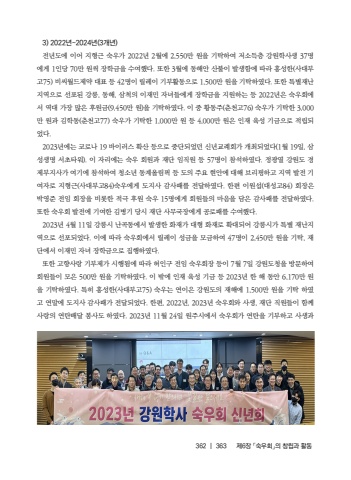 362 |363%uc81c6%uc7a5 %u300c%uc219%uc6b0%ud68c%u300d%uc758 %ucc3d%ub9bd%uacfc %ud65c%ub3d93) 2022%ub144~2024%ub144(3%uac1c%ub144) %uc804%ub144%ub3c4%uc5d0 %uc774%uc5b4 %uc9c0%ud615%uadfc %uc219%uc6b0%uac00 2022%ub144 2%uc6d4%uc5d0 2,550%ub9cc %uc6d0%uc744 %uae30%ud0c1%ud558%uc5ec %uc800%uc18c%ub4dd%uce35 %uac15%uc6d0%ud559%uc0ac%uc0dd 37%uba85%uc5d0%uac8c 1%uc778%ub2f9 70%ub9cc %uc6d0%uc529 %uc7a5%ud559%uae08%uc744 %uc218%uc5ec%ud588%ub2e4. %ub610%ud55c 3%uc6d4%uc5d0 %ub3d9%ud574%uc548 %uc0b0%ubd88%uc774 %ubc1c%uc0dd%ud568%uc5d0 %ub530%ub77c %ud64d%uc131%ud55c(%uc0ac%ub300%ubd80%uace075) %ube44%uc528%uc6d4%ub4dc%uc81c%uc57d %ub300%ud45c %ub4f1 42%uba85%uc774 %ub9b4%ub808%uc774 %uae30%ubd80%ud65c%ub3d9%uc73c%ub85c 1,500%ub9cc %uc6d0%uc744 %uae30%ud0c1%ud558%uc600%ub2e4. %ub610%ud55c %ud2b9%ubcc4%uc7ac%ub09c %uc9c0%uc5ed%uc73c%ub85c %uc120%ud3ec%ub41c %uac15%ub989, %ub3d9%ud574, %uc0bc%ucc99%uc758 %uc774%uc7ac%ubbfc %uc790%ub140%ub4e4%uc5d0%uac8c %uc7a5%ud559%uae08%uc744 %uc9c0%uc6d0%ud558%ub294 %ub4f1 2022%ub144%uc740 %uc219%uc6b0%ud68c%uc5d0%uc11c %uc5ed%ub300 %uac00%uc7a5 %ub9ce%uc740 %ud6c4%uc6d0%uae08(9,450%ub9cc %uc6d0)%uc744 %uae30%ud0c1%ud558%uc600%ub2e4. %uc774 %uc911 %ud669%ub3d9%uc8fc(%ucd98%ucc9c%uace076) %uc219%uc6b0%uac00 %uae30%ud0c1%ud55c 3,000%ub9cc %uc6d0%uacfc %uae40%ud559%ub3d9(%ucd98%ucc9c%uace077) %uc219%uc6b0%uac00 %uae30%ud0c1%ud55c 1,000%ub9cc %uc6d0 %ub4f1 4,000%ub9cc %uc6d0%uc740 %uc778%uc7ac %uc721%uc131 %uae30%uae08%uc73c%ub85c %uc801%ub9bd%ub418%uc5c8%ub2e4.2023%ub144%uc5d0%ub294 %ucf54%ub85c%ub098 19 %ubc14%uc774%ub7ec%uc2a4 %ud655%uc0b0 %ub4f1%uc73c%ub85c %uc911%ub2e8%ub418%uc5c8%ub358 %uc2e0%ub144%uad50%ub840%ud68c%uac00 %uac1c%ucd5c%ub418%uc5c8%ub2e4(1%uc6d4 19%uc77c, %uc0bc%uc131%uc0dd%uba85 %uc11c%ucd08%ud0c0%uc6cc). %uc774 %uc790%ub9ac%uc5d0%ub294 %uc219%uc6b0 %ud68c%uc6d0%uacfc %uc7ac%ub2e8 %uc784%uc9c1%uc6d0 %ub4f1 57%uba85%uc774 %ucc38%uc11d%ud558%uc600%ub2e4. %uc815%uad11%uc5f4 %uac15%uc6d0%ub3c4 %uacbd%uc81c%ubd80%uc9c0%uc0ac%uac00 %uc5ec%uae30%uc5d0 %ucc38%uc11d%ud558%uc5ec %uccad%uc18c%ub144 %ub3d9%uacc4%uc62c%ub9bc%ud53d %ub4f1 %ub3c4%uc758 %uc8fc%uc694 %ud604%uc548%uc5d0 %ub300%ud574 %ube0c%ub9ac%ud551%ud558%uace0 %uc9c0%uc5ed %ubc1c%uc804 %uae30%uc5ec%uc790%ub85c %uc9c0%ud615%uadfc(%uc0ac%ub300%ubd80%uace084)%uc219%uc6b0%uc5d0%uac8c %ub3c4%uc9c0%uc0ac %uac10%uc0ac%ud328%ub97c %uc804%ub2ec%ud558%uc600%ub2e4. %ud55c%ud3b8 %uc774%uc6d0%uc12d(%ub300%uc131%uace084) %ud68c%uc7a5%uc740 %ubc15%uc601%uc900 %uc804%uc784 %ud68c%uc7a5%uc744 %ube44%ub86f%ud55c %uc801%uadf9 %ud6c4%uc6d0 %uc219%uc6b0 15%uba85%uc5d0%uac8c %ud68c%uc6d0%ub4e4%uc758 %ub9c8%uc74c%uc744 %ub2f4%uc740 %uac10%uc0ac%ud328%ub97c %uc804%ub2ec%ud558%uc600%ub2e4. %ub610%ud55c %uc219%uc6b0%ud68c %ubc1c%uc804%uc5d0 %uae30%uc5ec%ud55c %uae40%ubcd1%uae30 %ub2f9%uc2dc %uc7ac%ub2e8 %uc0ac%ubb34%uad6d%uc7a5%uc5d0%uac8c %uacf5%ub85c%ud328%ub97c %uc218%uc5ec%ud588%ub2e4.2023%ub144 4%uc6d4 11%uc77c %uac15%ub989%uc2dc %ub09c%uace1%ub3d9%uc5d0%uc11c %ubc1c%uc0dd%ud55c %ud654%uc7ac%uac00 %ub300%ud615 %ud654%uc7ac%ub85c %ud655%ub300%ub418%uc5b4 %uac15%ub989%uc2dc%uac00 %ud2b9%ubcc4 %uc7ac%ub09c%uc9c0%uc5ed%uc73c%ub85c %uc120%ud3ec%ub418%uc5c8%ub2e4. %uc774%uc5d0 %ub530%ub77c %uc219%uc6b0%ud68c%uc5d0%uc11c %ub9b4%ub808%uc774 %uc131%uae08%uc744 %ubaa8%uae08%ud558%uc5ec 47%uba85%uc774 2,450%ub9cc %uc6d0%uc744 %uae30%ud0c1, %uc7ac%ub2e8%uc5d0%uc11c %uc774%uc7ac%ubbfc %uc790%ub140 %uc7a5%ud559%uae08%uc73c%ub85c %uc9d1%ud589%ud558%uc600%ub2e4.%ub610%ud55c %uace0%ud5a5%uc0ac%ub791 %uae30%ubd80%uc81c%uac00 %uc2dc%ud589%ub428%uc5d0 %ub530%ub77c %ud5c8%uc778%uad6c %uc804%uc784 %uc219%uc6b0%ud68c%uc7a5 %ub4f1%uc774 7%uc6d4 7%uc77c %uac15%uc6d0%ub3c4%uccad%uc744 %ubc29%ubb38%ud558%uc5ec %ud68c%uc6d0%ub4e4%uc774 %ubaa8%uc740 500%ub9cc %uc6d0%uc744 %uae30%ud0c1%ud558%uc600%ub2e4. %uc774 %ubc16%uc5d0 %uc778%uc7ac %uc721%uc131 %uae30%uae08 %ub4f1 2023%ub144 %ud55c %ud574 %ub3d9%uc548 6,170%ub9cc %uc6d0%uc744 %uae30%ud0c1%ud558%uc600%ub2e4. %ud2b9%ud788 %ud64d%uc131%ud55c(%uc0ac%ub300%ubd80%uace075) %uc219%uc6b0%ub294 %uc5f0%uc774%uc740 %uac15%uc6d0%ub3c4%uc758 %uc7ac%ud574%uc5d0 1,500%ub9cc %uc6d0%uc744 %uae30%ud0c1 %ud558%uc600%uace0 %uc5f0%ub9d0%uc5d0 %ub3c4%uc9c0%uc0ac %uac10%uc0ac%ud328%uac00 %uc804%ub2ec%ub418%uc5c8%ub2e4. %ud55c%ud3b8, 2022%ub144, 2023%ub144 %uc219%uc6b0%ud68c%uc640 %uc0ac%uc0dd, %uc7ac%ub2e8 %uc9c1%uc6d0%ub4e4%uc774 %ud568%uaed8 %uc0ac%ub791%uc758 %uc5f0%ud0c4%ubc30%ub2ec %ubd09%uc0ac%ub3c4 %ud558%uc600%ub2e4. 2023%ub144 11%uc6d4 24%uc77c %uc6d0%uc8fc%uc2dc%uc5d0%uc11c %uc219%uc6b0%ud68c%uac00 %uc5f0%ud0c4%uc744 %uae30%ubd80%ud558%uace0 %uc0ac%uc0dd%uacfc