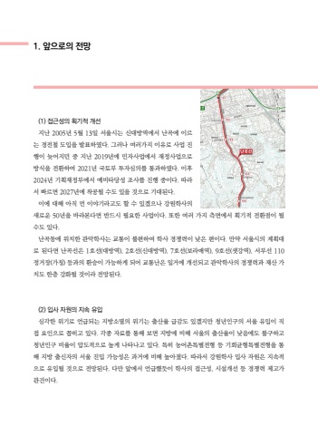 1. %uc55e%uc73c%ub85c%uc758 %uc804%ub9dd(1) %uc811%uadfc%uc131%uc758 %ud68d%uae30%uc801 %uac1c%uc120%uc9c0%ub09c 2005%ub144 5%uc6d4 13%uc77c %uc11c%uc6b8%uc2dc%ub294 %uc2e0%ub300%ubc29%uc5ed%uc5d0%uc11c %ub09c%uace1%uc5d0 %uc774%ub974%ub294 %uacbd%uc804%ucca0 %ub3c4%uc785%uc744 %ubc1c%ud45c%ud558%uc600%ub2e4. %uadf8%ub7ec%ub098 %uc5ec%ub7ec%uac00%uc9c0 %uc774%uc720%ub85c %uc0ac%uc5c5 %uc9c4%ud589%uc774 %ub2a6%uc5b4%uc9c0%ub358 %uc911 %uc9c0%ub09c 2019%ub144%uc5d0 %ubbfc%uc790%uc0ac%uc5c5%uc5d0%uc11c %uc7ac%uc815%uc0ac%uc5c5%uc73c%ub85c %ubc29%uc2dd%uc744 %uc804%ud658%ud558%uc5ec 2021%ub144 %uad6d%ud1a0%ubd80 %ud22c%uc790%uc2ec%uc758%ub97c %ud1b5%uacfc%ud558%uc600%ub2e4. %uc774%ud6c4 2024%ub144 %uae30%ud68d%uc7ac%uc815%ubd80%uc5d0%uc11c %uc608%ube44%ud0c0%ub2f9%uc131 %uc870%uc0ac%ub97c %uc9c4%ud589 %uc911%uc774%ub2e4. %ub530%ub77c%uc11c %ube60%ub974%uba74 2027%ub144%uc5d0 %ucc29%uacf5%ub420 %uc218%ub3c4 %uc788%uc744 %uac83%uc73c%ub85c %uae30%ub300%ub41c%ub2e4. %uc774%uc5d0 %ub300%ud574 %uc544%uc9c1 %uba3c %uc774%uc57c%uae30%ub77c%uace0%ub3c4 %ud560 %uc218 %uc788%uaca0%uc73c%ub098 %uac15%uc6d0%ud559%uc0ac%uc758 %uc0c8%ub85c%uc6b4 50%ub144%uc744 %ubc14%ub77c%ubcf8%ub2e4%uba74 %ubc18%ub4dc%uc2dc %ud544%uc694%ud55c %uc0ac%uc5c5%uc774%ub2e4. %ub610%ud55c %uc5ec%ub7ec %uac00%uc9c0 %uce21%uba74%uc5d0%uc11c %ud68d%uae30%uc801 %uc804%ud658%uc810%uc774 %ub420 %uc218%ub3c4 %uc788%ub2e4.%ub09c%uace1%ub3d9%uc5d0 %uc704%uce58%ud55c %uad00%uc545%ud559%uc0ac%ub294 %uad50%ud1b5%uc774 %ubd88%ud3b8%ud558%uc5ec %ud559%uc0ac %uacbd%uc7c1%ub825%uc774 %ub0ae%uc740 %ud3b8%uc774%ub2e4. %ub9cc%uc57d %uc11c%uc6b8%uc2dc%uc758 %uacc4%ud68d%ub300%ub85c %ub41c%ub2e4%uba74 %ub09c%uace1%uc120%uc740 1%ud638%uc120(%ub300%ubc29%uc5ed), 2%ud638%uc120(%uc2e0%ub300%ubc29%uc5ed), 7%ud638%uc120(%ubcf4%ub77c%ub9e4%uc5ed), 9%ud638%uc120(%uc0db%uac15%uc5ed), %uc11c%ubd80%uc120 110 %uc815%uac70%uc7a5(%uac00%uce6d) %ub4f1%uacfc%uc758 %ud658%uc2b9%uc774 %uac00%ub2a5%ud558%uac8c %ub418%uc5b4 %uad50%ud1b5%ub09c%uc740 %uc77c%uac70%uc5d0 %uac1c%uc120%ub418%uace0 %uad00%uc545%ud559%uc0ac%uc758 %uacbd%uc7c1%ub825%uacfc %uc7ac%uc0b0 %uac00%uce58%ub3c4 %ud55c%uce35 %uac15%ud654%ub420 %uac83%uc774%ub77c %uc804%ub9dd%ub41c%ub2e4. (2) %uc785%uc0ac %uc790%uc6d0%uc758 %uc9c0%uc18d %uc720%uc785%uc2ec%uac01%ud55c %uc704%uae30%ub85c %uc5b8%uae09%ub418%ub294 %uc9c0%ubc29%uc18c%uba78%uc758 %uc704%uae30%ub294 %ucd9c%uc0b0%uc728 %uae09%uac10%ub3c4 %uc788%uaca0%uc9c0%ub9cc %uccad%ub144%uc778%uad6c%uc758 %uc11c%uc6b8 %uc720%uc785%uc774 %uc9c1%uc811 %uc694%uc778%uc73c%ub85c %uaf3d%ud788%uace0 %uc788%ub2e4. %uac01%uc885 %uc790%ub8cc%ub97c %ud1b5%ud574 %ubcf4%uba74 %uc9c0%ubc29%uc5d0 %ube44%ud574 %uc11c%uc6b8%uc758 %ucd9c%uc0b0%uc728%uc774 %ub0ae%uc74c%uc5d0%ub3c4 %ubd88%uad6c%ud558%uace0 %uccad%ub144%uc778%uad6c %ube44%uc728%uc774 %uc555%ub3c4%uc801%uc73c%ub85c %ub192%uac8c %ub098%ud0c0%ub098%uace0 %uc788%ub2e4. %ud2b9%ud788 %ub18d%uc5b4%ucd0c%ud2b9%ubcc4%uc804%ud615 %ub4f1 %uae30%ud68c%uade0%ud615%ud2b9%ubcc4%uc804%ud615%uc744 %ud1b5%ud574 %uc9c0%ubc29 %ucd9c%uc2e0%uc790%uc758 %uc11c%uc6b8 %uc9c4%uc785 %uac00%ub2a5%uc131%uc740 %uacfc%uac70%uc5d0 %ube44%ud574 %ub192%uc544%uc84c%ub2e4. %ub530%ub77c%uc11c %uac15%uc6d0%ud559%uc0ac %uc785%uc0ac %uc790%uc6d0%uc740 %uc9c0%uc18d%uc801%uc73c%ub85c %uc720%uc785%ub420 %uac83%uc73c%ub85c %uc804%ub9dd%ub41c%ub2e4. %ub2e4%ub9cc %uc55e%uc5d0%uc11c %uc5b8%uae09%ud588%ub4ef%uc774 %ud559%uc0ac%uc758 %uc811%uadfc%uc131, %uc2dc%uc124%uac1c%uc120 %ub4f1 %uacbd%uc7c1%ub825 %uc81c%uace0%uac00 %uad00%uac74%uc774%ub2e4.