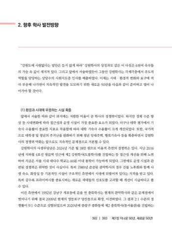 392 |393%uc81c7%uc7a5 %uc9c0%ub098%uc628 50%ub144, %uc0c8%ub85c%uc6b4 50%ub144!2. %ud5a5%ud6c4 %ud559%uc0ac %ubc1c%uc804%ubc29%ud5a5 %u201c%uac15%uc6d0%ub3c4%uc5d0 %uc0ac%ub78c%uc5c6%ub2e4%ub294 %ub9d0%ub9cc%uc740 %ub4e3%uc9c0 %uc54a%uac8c %ud558%ub77c%u201d %uac15%uc6d0%ud559%uc0ac%uc758 %uc0c1%uc9d5%uacfc%ub3c4 %uac19%uc740 %uc774 %ub2e4%uc9d0%uc740 6%ucc9c%uc5ec %uc219%uc6b0%ub4e4%uc758 %uac00%uc2b4 %uc18d %uae4a%uc774 %uc0c8%uaca8%uc838 %uc788%ub2e4. %uadf8%ub9ac%uace0 %uc55e%uc5d0%uc11c %uc11c%uc220%ud558%uc600%ub4ef%uc774 %uadf8%ub3d9%uc548 %uac15%uc6d0%ud559%uc0ac%ub294 %uac01%uacc4%uac01%uce35%uc5d0%uc11c %uc8fc%ub3c4%uc801 %uc5ed%ud560%uc744 %ub2f4%ub2f9%ud558%ub294 %uc0c1%ub2f9%uc218%uc758 %uc0ac%ud68c%uc9c0%ub3c4%uce35 %uc778%uc0ac%ub97c %ubc30%ucd9c%ud558%uc600%ub2e4. %uc774%uc81c%ub294 %uc2dc%ub300 %u00b7 %ud658%uacbd%uc801 %ubcc0%ud654%uc640 %uc694%uad6c%uc5d0 %uc801%uadf9 %ubd80%uc751%ud574 %ub098%uac00%uba74%uc11c %uc9c0%uc18d%uc801%uc778 %ubc1c%uc804%uc744 %ub3c4%ubaa8%ud558%uae30 %uc704%ud55c %uc0c8%ub85c%uc6b4 50%ub144%uc744 %ub2e4%uc74c%uacfc %uac19%uc774 %uc900%ube44%ud558%uace0 %uc5f4%uc5b4 %ub098%uc544%uac00%uc57c %ud560 %uac83%uc774%ub2e4.(1) %ud658%uacbd%uacfc %uc2dc%ub300%uc5d0 %ubd80%uc751%ud558%ub294 %uc2dc%uc124 %ud655%ucda9%uc55e%uc5d0%uc11c %uc11c%uc220%ud55c %ubc14%uc640 %uac19%uc774 %uacfc%uac70%uc5d0%ub294 %uc800%ub834%ud55c %ube44%uc6a9%uc774 %uace7 %ud559%uc0ac%uc758 %uacbd%uc7c1%ub825%uc774%uc5c8%ub2e4. %ud558%uc9c0%ub9cc %uacbd%uc81c %uc218%uc900 %ud5a5%uc0c1 %ub4f1 %uc2dc%ub300%ubcc0%ud654%uc5d0 %ub530%ub77c %uc811%uadfc%uc131%uacfc %uc6b4%uc601 %uc2dc%uc124%uc774 %uac00%uc7a5 %uc911%uc694%ud55c %uc694%uc18c%uac00 %ub418%uc5c8%ub2e4. %ub354%uad6c%ub098 %ub300%ud559 %ud3c9%uac00%uc5d0%uc11c %uae30%uc219%uc0ac %uc218%uc6a9%ub960%uc774 %uc911%uc694%ud55c %uc9c0%ud45c%ub85c %uc791%uc6a9%ud568%uc5d0 %ub530%ub77c %ub300%ud559 %uae30%uc219%uc0ac %uc218%uc6a9%ub960%uc774 %ud06c%uac8c %uac1c%uc120%ub418%uc5c8%ub2e4. %ub610%ud55c, %uad6d%uac00%uc801%uc73c%ub85c %ub300%ud559%uc0dd %ubc0f %uccad%ub144%uc758 %uc8fc%uac70%ub09c%uc744 %uc644%ud654%ud558%uae30 %uc704%ud574 %uccad%ub144 %uc784%ub300%uc8fc%ud0dd, %ud589%ubcf5%uae30%uc219%uc0ac %ub4f1%uc744 %ud655%ucda9%ud558%uba74%uc11c %uac15%uc6d0%ud559%uc0ac%uc758 %uacbd%uc7c1%ub825 %uc57d%ud654%ub294 %uc55e%uc73c%ub85c%ub3c4 %uc9c0%uc18d%uc801%uc778 %ubb38%uc81c%uc810%uc73c%ub85c %uac70%ub860%ub420 %uc218 %uc788%ub2e4. %uac15%uc6d0%ud559%uc0ac%uc758 %uc0ac%uc0dd%ubd80%ub2f4%uae08%uc740 2024%ub144 %uae30%uc900 %uc6d4 18%ub9cc %uc6d0%uc73c%ub85c %ube44%uc6a9%uc801 %uce21%uba74%uc758 %uacbd%uc7c1%ub825%uc740 %uc788%ub2e4. %uc9c0%ub09c 2016%ub144%uc5d0 %uc9c0%ud558%ucca0 4%ud638%uc120 %uc30d%ubb38%uc5ed %uc778%uadfc%uc5d0 %uc81c2 %uac15%uc6d0%ud559%uc0ac(%ub3c4%ubd09%ud559%uc0ac)%ub97c %uac74%ub9bd%ud558%ub294 %ub4f1 %uc811%uadfc%uc131 %uac1c%uc120%uc744 %uc704%ud574 %ub178%ub825%ud558%uc5ec %uc9c0%uae08%uc740 %uc11c%uc6b8 %uc2dc%ub0b4 %ub300%ub2e4%uc218 %ud559%uad50%ub294 60%ubd84 %uc774%ub0b4 %ud1b5%ud559%uc774 %uac00%ub2a5%ud558%uac8c %ub418%uc5c8%ub2e4. %uadf8%ub7fc%uc5d0%ub3c4 %uc6b4%uc601 %uc2dc%uc124%uacfc %uad00%ub828%ub41c %uacbd%uc7c1%ub825%uc740 %ucde8%uc57d%ud55c %uac83%uc774 %uc0ac%uc2e4%uc774%ub2e4. %ud2b9%ud788 1989%ub144 %uc900%uacf5%ub41c %uad00%uc545%ud559%uc0ac%uc758 %uacbd%uc6b0 %uac74%ubb3c %ub178%ud6c4%ud654%uc640 %ud568%uaed8 %uc0ac%uc0dd %uc219%uc18c, %ud654%uc7a5%uc2e4 %ub4f1 %uae30%ubcf8%uc801%uc778 %uc2dc%uc124%uc774 %uad6c%uc870%uc801%uc778 %uce21%uba74%uc5d0%uc11c %uc2dc%ub300%uc5d0 %ub4a4%ub5a8%uc5b4%uc838 %uc788%ub2e4%ub294 %uc9c0%uc801%uc744 %ubc1b%uace0 %uc788%ub2e4. %ud2b9%ud788 %uac08%uc218%ub85d %ud504%ub77c%uc774%ubc84%uc2dc%ub97c %uc911%uc694%uc2dc%ud558%ub294 %uc0c8%ub85c%uc6b4 %uc138%ub300%ub4e4%uc758 %uc120%ud638%ub3c4%ub97c %uace0%ub824%ud560 %ub54c %uac1c%uc120%uc774 %uc2dc%uae09%ud558%ub2e4%uace0 %ubcfc %uc218 %uc788%ub2e4.%uc774%ub7f0 %uce21%uba74%uc5d0%uc11c 1992%ub144 %uac15%ub0a8%uad6c %uac1c%ud3ec%ub3d9%uc5d0 %ubb38%uc744 %uc5f0 %ucda9%ubd81%ud559%uc0ac%ub294 %ud604%uc7ac%uc758 %uad00%uc545%ud559%uc0ac%uc640 %uac19%uc740 %ubb38%uc81c%uc810%uc5d0%uc11c %ubc97%uc5b4%ub098%uae30 %uc704%ud574 %uacb0%uad6d 2009%ub144 %ud604%uc7ac%uc758 %uc601%ub4f1%ud3ec%uad6c %ub2f9%uc0b0%ub3d9%uc73c%ub85c %ud655%uc7a5, %uc774%uc804%ud558%uc600%ub2e4. %uadf8 %uacb0%uacfc 2:1 %uc218%uc900%uc758 %uacbd%uc7c1%ub960%uc774 9:1 %uc218%uc900%uc73c%ub85c %uc0c1%ud5a5%ub418%uc5c8%uc73c%uba70 2020%ub144%uc5d0 %uc911%ub791%uad6c %uc911%ud654%ub3d9%uc5d0 %uc81c2 %ucda9%ubd81%ud559%uc0ac(%ub3d9%uc11c%uc6b8%uad00)%uc744 %uac74%ub9bd%ud558%ub294