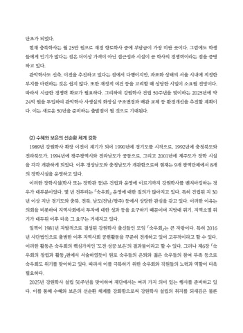 %ub2e8%ucd08%uac00 %ub418%uc5c8%ub2e4.%ud604%uc7ac %ucda9%ubd81%ud559%uc0ac%ub294 %uc6d4 25%ub9cc %uc6d0%uc73c%ub85c %uc7ac%uacbd %ud5a5%ud1a0%ud559%uc0ac %uc911%uc5d0 %ubd80%ub2f4%uae08%uc774 %uac00%uc7a5 %ube44%uc2fc %uacf3%uc774%ub2e4. %uadf8%ub7fc%uc5d0%ub3c4 %ud559%uc0dd%ub4e4%uc5d0%uac8c %uc778%uae30%uac00 %ub9ce%ub2e4%ub294 %uc810%uc740 %ub354%uc774%uc0c1 %uac00%uaca9%uc774 %uc544%ub2cc %uc811%uadfc%uc131%uacfc %uc2dc%uc124%uc774 %uace7 %ud559%uc0ac%uc758 %uacbd%uc7c1%ub825%uc774%ub77c%ub294 %uc810%uc744 %uc99d%uba85%ud558%uace0 %uc788%ub2e4.%uad00%uc545%ud559%uc0ac%ub3c4 %uc2e0%ucd95, %uc774%uc804%uc744 %ucd94%uc9c4%ud558%uace0 %uc788%ub2e4%ub294 %uc810%uc5d0%uc11c %ub2e4%ud589%uc774%uc9c0%ub9cc, %uacfc%ud3ec%ud654 %uc0c1%ud0dc%uc758 %uc11c%uc6b8 %uc2dc%ub0b4%uc5d0 %uc801%uc815%ud55c %ubd80%uc9c0%ub97c %ub9c8%ub828%ud558%ub294 %uac83%uc740 %uc27d%uc9c0 %uc54a%ub2e4. %ub610%ud55c %uc7ac%uc815%uc801 %uc5ec%uac74 %ub4f1%uc744 %uace0%ub824%ud560 %ub54c %uc0c1%ub2f9%ud55c %uc2dc%uc77c%uc774 %uc18c%uc694%ub420 %uc804%ub9dd%uc774%ub2e4. %ub530%ub77c%uc11c %uc2dc%uae09%ud55c %uacbd%uc7c1%ub825 %ud655%ubcf4%uac00 %ud544%uc694%ud558%ub2e4. %uadf8%ub9ac%ud558%uc5ec %uac15%uc6d0%ud559%uc0ac %uac74%ub9bd 50%uc8fc%ub144%uc744 %ub9de%uc774%ud558%ub294 2025%ub144%uc5d0 %uc57d 24%uc5b5 %uc6d0%uc744 %ud22c%uc785%ud558%uc5ec %uad00%uc545%ud559%uc0ac %uc0ac%uc0dd%uc2e4%uc758 %ud654%uc7a5%uc2e4 %uad6c%uc870%ubcc0%uacbd%uacfc %ubc30%uad00 %uad50%uccb4 %ub4f1 %ud658%uacbd%uac1c%uc120%uc744 %ucd94%uc9c4%ud560 %uacc4%ud68d%uc774%ub2e4. %uc774%ub294 %uc0c8%ub85c%uc6b4 50%ub144%uc744 %uc900%ube44%ud558%ub294 %ucd9c%ubc1c%uc810%uc774 %ub420 %uac83%uc73c%ub85c %uae30%ub300%ub41c%ub2e4.(2) %uc218%ud61c%uc640 %ubcf4%uc740%uc758 %uc120%uc21c%ud658 %uccb4%uacc4 %uac15%ud6541989%ub144 %uac15%uc6d0%ud559%uc0ac %ud655%uc7a5 %uc774%uc804%uc774 %uacc4%uae30%uac00 %ub418%uc5b4 1990%ub144%uc5d0 %uacbd%uae30%ub3c4%ub97c %uc2dc%uc791%uc73c%ub85c, 1992%ub144%uc5d0 %ucda9%uccad%ubd81%ub3c4%uc640 %uc804%ub77c%ubd81%ub3c4%uac00, 1994%ub144%uc5d0 %uad11%uc8fc%uad11%uc5ed%uc2dc%uc640 %uc804%ub77c%ub0a8%ub3c4%uac00 %uacf5%ub3d9%uc73c%ub85c, %uadf8%ub9ac%uace0 2001%ub144%uc5d0 %uc81c%uc8fc%ub3c4%uac00 %uc7a5%ud559 %uc2dc%uc124%uc744 %uac01%uac01 %uac1c%uad00%ud558%uac8c %ub418%uc5c8%ub2e4. %uc774%ud6c4 %uacbd%uc0c1%ub0a8%ub3c4%uc640 %ucda9%uccad%ub0a8%ub3c4%uac00 %uac1c%uad00%ud568%uc73c%ub85c%uc368 %ud604%uc7ac%ub294 9%uac1c %uad11%uc5ed%ub2e8%uccb4%uc5d0%uc11c 8%uac1c%uc758 %uc7a5%ud559%uc2dc%uc124%uc744 %uc6b4%uc601%ud558%uace0 %uc788%ub2e4. %uc774%ub7ec%ud55c %uc7a5%ud559%uc2dc%uc124(%ud559%uc0ac %ub610%ub294 %uc7a5%ud559%uad00 %ub4f1)%uc740 %uac74%ub9bd%uacfc %uc6b4%uc601%uc5d0 %uc774%ub974%uae30%uae4c%uc9c0 %uac15%uc6d0%ud559%uc0ac%ub97c %ubca4%uce58%ub9c8%ud0b9%ud558%ub294 %uacbd%uc6b0%uac00 %ub300%ubd80%ubd84%uc774%uc5c8%ub2e4. %uba87 %ub144 %uc804%ubd80%ud130%ub294 %u300c%uc219%uc6b0%ud68c%u300d %uc6b4%uc601%uc5d0 %ub300%ud55c %uc9c8%uc758%uac00 %ub9ce%uc544%uc9c0%uace0 %uc788%ub2e4. %ud2b9%ud788 %uac74%ub9bd%ub41c %uc9c0 30%ub144 %uc774%uc0c1 %uc9c0%ub09c %uacbd%uae30%ub3c4%uc640 %ucda9%ubd81, %uc804%ubd81, %ub0a8%ub3c4(%uc804%ub0a8/%uad11%uc8fc) %ub4f1%uc5d0%uc11c %uc0c1%ub2f9%ud55c %uad00%uc2ec%uc744 %uac16%uace0 %uc788%ub2e4. %uc774%ub7ec%ud55c %uc774%uc720%ub294 %uc758%ud68c%uc744 %ube44%ub86f%ud558%uc5ec %uc9c0%uc5ed%uc0ac%ud68c%uc5d0%uc11c %ud22c%uc790%uc5d0 %ub300%ud55c %uc131%uacfc %ub4f1%uc744 %uc694%uad6c%ud558%uae30 %ub54c%ubb38%uc774%uba70 %uc9c0%ubc29%ub300 %uc704%uae30, %uc9c0%uc5ed%uc18c%uba78 %uc704%uae30%uac00 %ub300%ub450%ub41c %uc774%ud6c4 %ub354%uc6b1 %uadf8 %uc694%uad6c%ub294 %uac70%uc138%uc9c0%uace0 %uc788%ub2e4.%uc77c%ucc0d%uc774 1981%ub144 %uc790%ubc1c%uc801%uc73c%ub85c %uacb0%uc131%ub41c %uac15%uc6d0%ud559%uc0ac %ucd9c%uc2e0%ub4e4%uc778 %ubaa8%uc784 %u300c%uc219%uc6b0%ud68c%u300d%ub294 %ud070 %uc790%ub791%uc774%ub2e4. %ud2b9%ud788 2016%ub144 %uc0ac%ub2e8%ubc95%uc778%uc73c%ub85c %ucd9c%ubc94%ud55c %uc774%ud6c4 %uc9c0%uc5ed%uc0ac%ud68c %uacf5%ud5cc%ud65c%ub3d9%uc744 %uafb8%uc900%ud788 %uc804%uac1c%ud558%uace0 %uc788%uc5b4 %uace0%ubb34%uc801%uc774%ub77c%uace0 %ud560 %uc218 %uc788%ub2e4. %uc774%ub7ec%ud55c %ud65c%ub3d9%uc740 %uc219%uc6b0%ud68c%uc758 %ud575%uc2ec%uac00%uce58%uc778 %u2018%ub3c4%uc804%u00b7%uc131%uacf5%u00b7%ubcf4%uc740%u2019%uc758 %uacb0%uacfc%ubb3c%uc774%ub77c%uace0 %ud560 %uc218 %uc788%ub2e4. %uadf8%ub7ec%ub098 %uc81c6%uc7a5 %u300c%uc219%uc6b0%ud68c%uc758 %ucc3d%ub9bd%uacfc %ud65c%ub3d9%u300d%ud3b8%uc5d0%uc11c %uc11c%uc220%ud558%uc600%ub4ef%uc774 %uc6d0%ub85c %uc219%uc6b0%ub4e4%uc758 %uc740%ud1f4%uc640 %uc80a%uc740 %uc219%uc6b0%ub4e4%uc758 %ucc38%uc5ec %ubd80%uc871 %ub4f1%uc73c%ub85c %uc219%uc6b0%ud68c%ub3c4 %uc704%uae30%ub97c %ub9de%uc774%ud558%uace0 %uc788%ub2e4. %ub530%ub77c%uc11c %uc774%ub97c %uadf9%ubcf5%ud558%uae30 %uc704%ud55c %uc219%uc6b0%ud68c%uc640 %uc9c1%uc6d0%ub4e4%uc758 %ub178%ub825%uacfc %uc5ed%ud560%uc774 %ub354%uc6b1 %ud544%uc694%ud558%ub2e4.2025%ub144 %uac15%uc6d0%ud559%uc0ac %uc124%ub9bd 50%uc8fc%ub144%uc744 %ub9de%uc774%ud558%uc5ec %uc7ac%ub2e8%uc5d0%uc11c%ub294 %uc5ec%ub7ec %uac00%uc9c0 %uc758%ubbf8 %uc788%ub294 %ud589%uc0ac%ub97c %uc900%ube44%ud558%uace0 %uc788%ub2e4. %uc774%ub97c %ud1b5%ud574 %uc218%ud61c%uc640 %ubcf4%uc740%uc758 %uc120%uc21c%ud658 %uccb4%uacc4%ub97c %uac15%ud654%ud568%uc73c%ub85c%uc368 %uac15%uc6d0%ud559%uc0ac %uc124%ub9bd%uc758 %ucde8%uc9c0%ub97c %ub418%uc0c8%uae40%uc740 %ubb3c%ub860