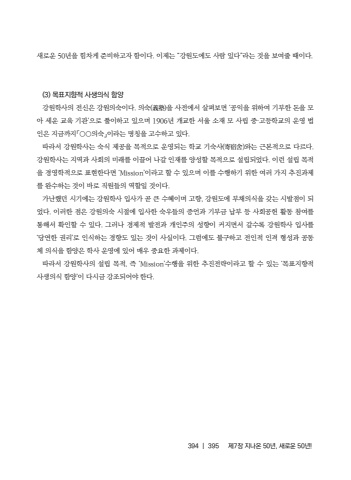 394 |395%uc81c7%uc7a5 %uc9c0%ub098%uc628 50%ub144, %uc0c8%ub85c%uc6b4 50%ub144!%uc0c8%ub85c%uc6b4 50%ub144%uc744 %ud798%ucc28%uac8c %uc900%ube44%ud558%uace0%uc790 %ud568%uc774%ub2e4. %uc774%uc81c%ub294 %u201c%uac15%uc6d0%ub3c4%uc5d0%ub3c4 %uc0ac%ub78c %uc788%ub2e4%u201d%ub77c%ub294 %uac83%uc744 %ubcf4%uc5ec%uc904 %ub54c%uc774%ub2e4.(3) %ubaa9%ud45c%uc9c0%ud5a5%uc801 %uc0ac%uc0dd%uc758%uc2dd %ud568%uc591%uac15%uc6d0%ud559%uc0ac%uc758 %uc804%uc2e0%uc740 %uac15%uc6d0%uc758%uc219%uc774%ub2e4. %uc758%uc219(%u7fa9%u587e)%uc744 %uc0ac%uc804%uc5d0%uc11c %uc0b4%ud3b4%ubcf4%uba74 %u2018%uacf5%uc775%uc744 %uc704%ud558%uc5ec %uae30%ubd80%ud55c %ub3c8%uc744 %ubaa8%uc544 %uc138%uc6b4 %uad50%uc721 %uae30%uad00%u2019%uc73c%ub85c %ud480%uc774%ud558%uace0 %uc788%uc73c%uba70 1906%ub144 %uac1c%uad50%ud55c %uc11c%uc6b8 %uc18c%uc7ac %ubaa8 %uc0ac%ub9bd %uc911%u00b7%uace0%ub4f1%ud559%uad50%uc758 %uc6b4%uc601 %ubc95%uc778%uc740 %uc9c0%uae08%uae4c%uc9c0%u300c%u25cb%u25cb%uc758%uc219%u300d%uc774%ub77c%ub294 %uba85%uce6d%uc744 %uace0%uc218%ud558%uace0 %uc788%ub2e4.%ub530%ub77c%uc11c %uac15%uc6d0%ud559%uc0ac%ub294 %uc219%uc2dd %uc81c%uacf5%uc744 %ubaa9%uc801%uc73c%ub85c %uc6b4%uc601%ub418%ub294 %ud559%uad50 %uae30%uc219%uc0ac(%u5bc4%u5bbf%u820d)%uc640%ub294 %uadfc%ubcf8%uc801%uc73c%ub85c %ub2e4%ub974%ub2e4. %uac15%uc6d0%ud559%uc0ac%ub294 %uc9c0%uc5ed%uacfc %uc0ac%ud68c%uc758 %ubbf8%ub798%ub97c %uc774%ub04c%uc5b4 %ub098%uac08 %uc778%uc7ac%ub97c %uc591%uc131%ud560 %ubaa9%uc801%uc73c%ub85c %uc124%ub9bd%ub418%uc5c8%ub2e4. %uc774%ub7f0 %uc124%ub9bd %ubaa9%uc801%uc744 %uacbd%uc601%ud559%uc801%uc73c%ub85c %ud45c%ud604%ud55c%ub2e4%uba74 %u2018Mission%u2019%uc774%ub77c%uace0 %ud560 %uc218 %uc788%uc73c%uba70 %uc774%ub97c %uc218%ud589%ud558%uae30 %uc704%ud55c %uc5ec%ub7ec %uac00%uc9c0 %ucd94%uc9c4%uacfc%uc81c%ub97c %uc644%uc218%ud558%ub294 %uac83%uc774 %ubc14%ub85c %uc9c1%uc6d0%ub4e4%uc758 %uc5ed%ud560%uc77c %uac83%uc774%ub2e4.%uac00%ub09c%ud588%ub358 %uc2dc%uae30%uc5d0%ub294 %uac15%uc6d0%ud559%uc0ac %uc785%uc0ac%uac00 %uace7 %ud070 %uc218%ud61c%uc774%uba70 %uace0%ud5a5, %uac15%uc6d0%ub3c4%uc5d0 %ubd80%ucc44%uc758%uc2dd%uc744 %uac16%ub294 %uc2dc%ubc1c%uc810%uc774 %ub418%uc5c8%ub2e4. %uc774%ub7ec%ud55c %uc810%uc740 %uac15%uc6d0%uc758%uc219 %uc2dc%uc808%uc5d0 %uc785%uc0ac%ud55c %uc219%uc6b0%ub4e4%uc758 %uc99d%uc5b8%uacfc %uae30%ubd80%uae08 %ub0a9%ubd80 %ub4f1 %uc0ac%ud68c%uacf5%ud5cc %ud65c%ub3d9 %ucc38%uc5ec%ub97c %ud1b5%ud574%uc11c %ud655%uc778%ud560 %uc218 %uc788%ub2e4. %uadf8%ub7ec%ub098 %uacbd%uc81c%uc801 %ubc1c%uc804%uacfc %uac1c%uc778%uc8fc%uc758 %uc131%ud5a5%uc774 %ucee4%uc9c0%uba74%uc11c %uac08%uc218%ub85d %uac15%uc6d0%ud559%uc0ac %uc785%uc0ac%ub97c %u2018%ub2f9%uc5f0%ud55c %uad8c%ub9ac%u2019%ub85c %uc778%uc2dd%ud558%ub294 %uacbd%ud5a5%ub3c4 %uc788%ub294 %uac83%uc774 %uc0ac%uc2e4%uc774%ub2e4. %uadf8%ub7fc%uc5d0%ub3c4 %ubd88%uad6c%ud558%uace0 %uc804%uc778%uc801 %uc778%uaca9 %ud615%uc131%uacfc %uacf5%ub3d9%uccb4 %uc758%uc2dd%uc744 %ud568%uc591%uc740 %ud559%uc0ac %uc6b4%uc601%uc5d0 %uc788%uc5b4 %ub9e4%uc6b0 %uc911%uc694%ud55c %uacfc%uc81c%uc774%ub2e4.%ub530%ub77c%uc11c %uac15%uc6d0%ud559%uc0ac%uc758 %uc124%ub9bd %ubaa9%uc801, %uc989 %u2018Mission%u2019%uc218%ud589%uc744 %uc704%ud55c %ucd94%uc9c4%uc804%ub7b5%uc774%ub77c%uace0 %ud560 %uc218 %uc788%ub294 %u2018%ubaa9%ud45c%uc9c0%ud5a5%uc801 %uc0ac%uc0dd%uc758%uc2dd %ud568%uc591%u2019%uc774 %ub2e4%uc2dc%uae08 %uac15%uc870%ub418%uc5b4%uc57c %ud55c%ub2e4.