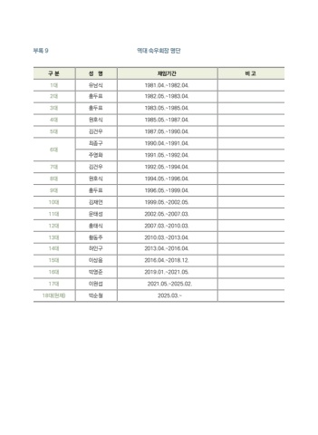 %ubd80%ub85d 9%uc5ed%ub300 %uc219%uc6b0%ud68c%uc7a5 %uba85%ub2e8%uad6c %ubd84%uc131 %uba85%uc7ac%uc784%uae30%uac04%ube44 %uace01%ub300%uc720%ub0a8%uc2dd1981.04.~1982.04.2%ub300%ud64d%ub450%ud45c1982.05.~1983.04.3%ub300%ud64d%ub450%ud45c1983.05.~1985.04.4%ub300%uc6d0%ud638%uc2dd1985.05.~1987.04.5%ub300%uae40%uac74%uc6b01987.05.~1990.04.6%ub300%ucd5c%uc885%uad6c1990.04.~1991.04.%uc8fc%uc601%ud6541991.05.~1992.04.7%ub300%uae40%uac74%uc6b01992.05.~1994.04.8%ub300%uc6d0%ud638%uc2dd1994.05.~1996.04.9%ub300%ud64d%ub450%ud45c1996.05.~1999.04.10%ub300%uae40%uc7ac%uc5b81999.05.~2002.05.11%ub300%ubb38%ud0dc%uc1312002.05.~2007.03.12%ub300%ud64d%ud0dc%uc2dd2007.03.~2010.03.13%ub300%ud669%ub3d9%uc8fc2010.03.~2013.04.14%ub300%ud5c8%uc778%uad6c2013.04.~2016.04.15%ub300%uc774%uc0c1%uc6a92016.04.~2018.12.16%ub300%ubc15%uc601%uc9002019.01.~2021.05.17%ub300%uc774%uc6d0%uc12d 2021.05.~2025.02.18%ub300(%ud604%uc7ac)%ubc15%uc21c%ucca0 2025.03.~